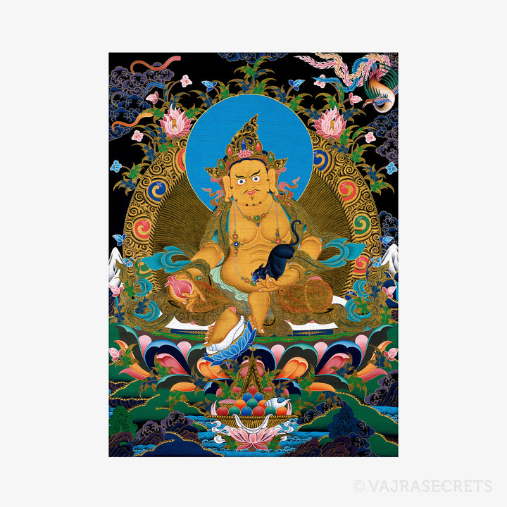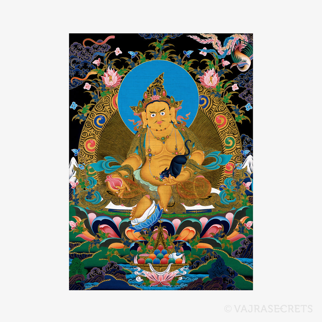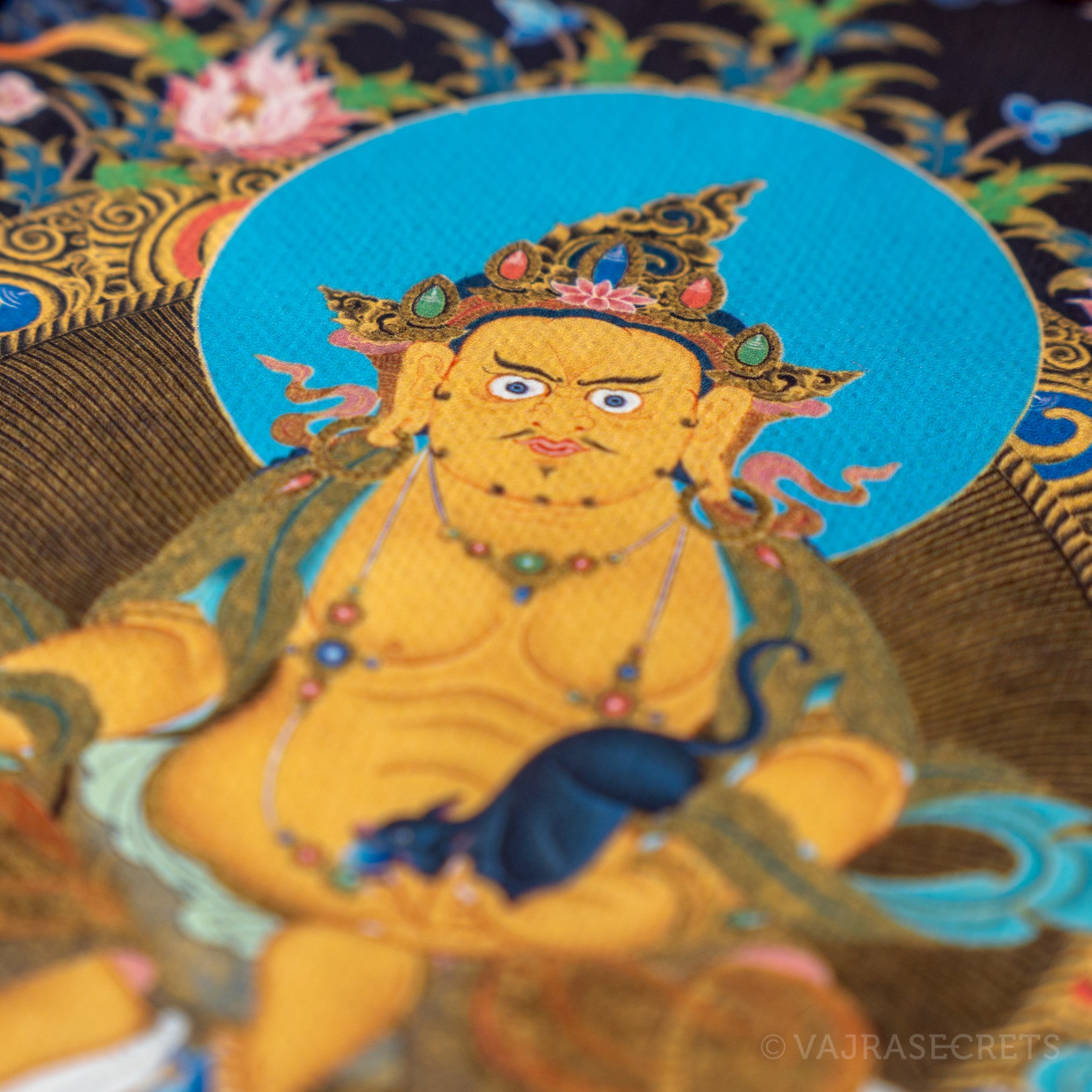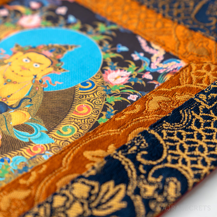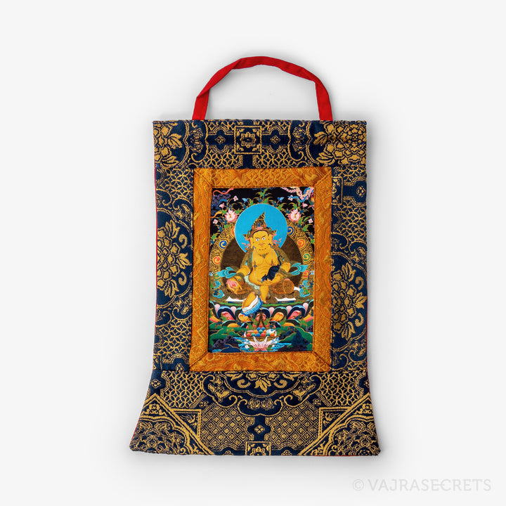 A miniature thangka of Yellow Dzambala, the Buddha of Wealth, featuring a high quality giclée canvas print and mounted on a rich brocade frame. Known for alleviating financial problems and granting outer & inner wealth, he is especially beneficial for businessmen, those struggling to make ends meet, and anyone seeking worldly and spiritual success. Well-suited for a travel altar or compact workplace shrine.