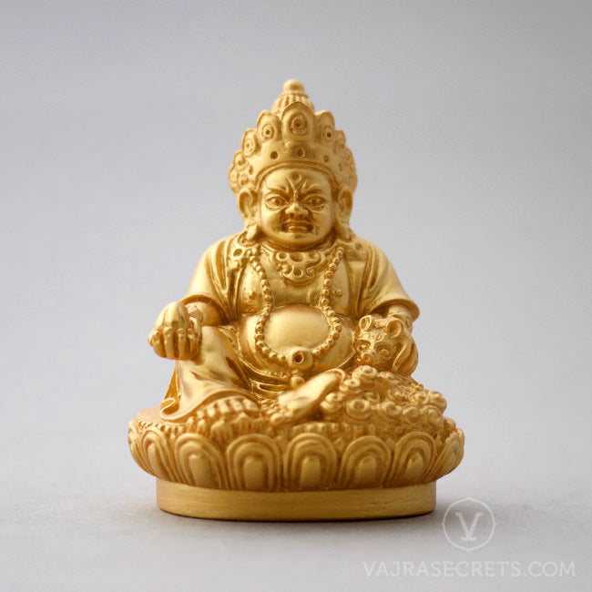 A gold-painted resin tsa tsa of Buddha Dzambala, a powerful wealth Buddha who brings material prosperity, spiritual wealth and helps overcome financial challenges. Dzambala also brings us spiritual wealth and helps us overcome emotional poverty: miserliness, greed and the inability to give or share.