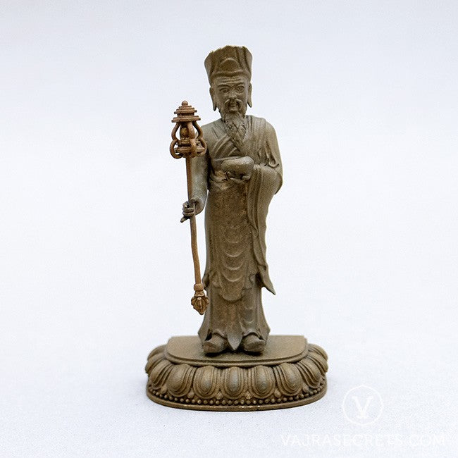 The second of the Eight Guiding Monks, Gelong Sanggyin represents the Bodhisattva Ksitigarbha, the personification of the Buddha's merit who increases the richness and fertility of the land. He wears monk robes, a pointed monk's hat and stands in a dancing posture. He holds a vajra in his right hand, a bell in his left and abides amidst a gathering of rainbows and clouds. In Dorje Shugden's mandala, he is to the left of Gelong Jampa and represents the eye sense power of Lama Losang Tubwang Dorje Chang's body.