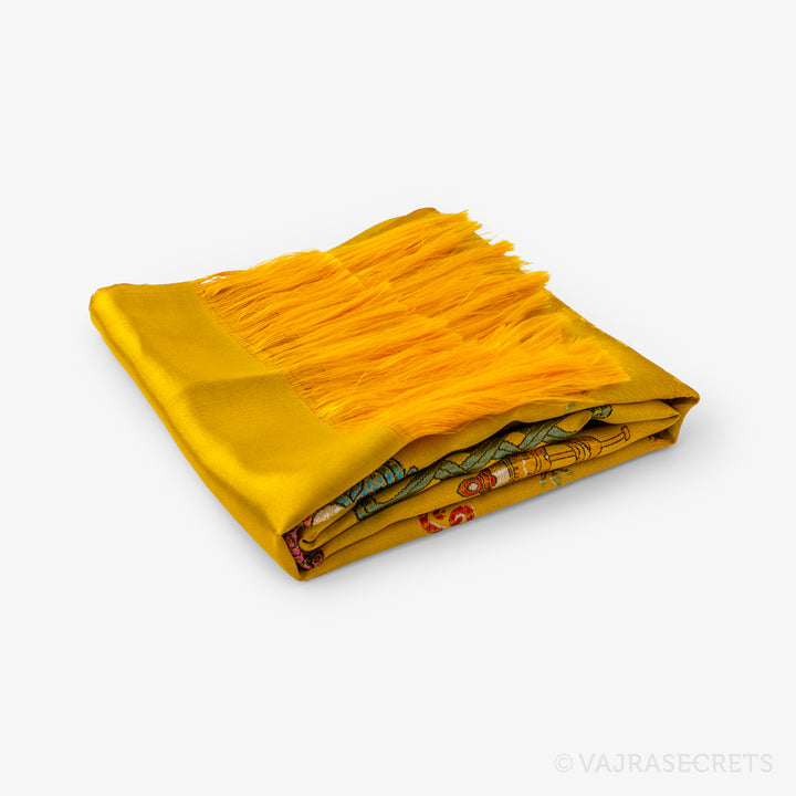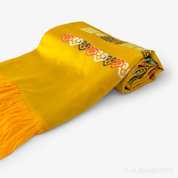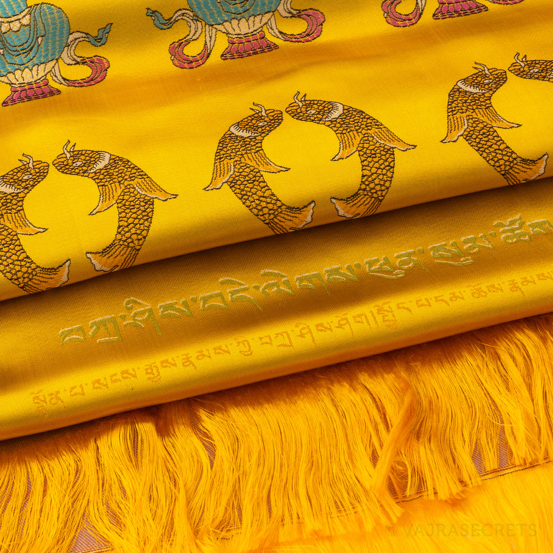 A premium Tibetan ceremonial scarf embroidered with the Eight Auspicious Signs, representing purity, respect, auspiciousness and good wishes. It can be offered to the Buddhas, to your spiritual teacher to request blessings, to elders as a respectful greeting, or to friends and family as a gesture of goodwill.