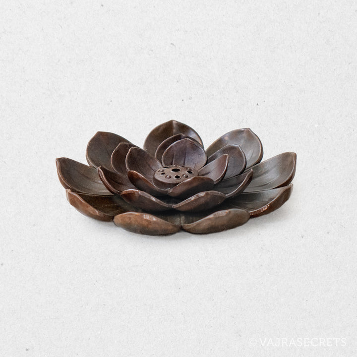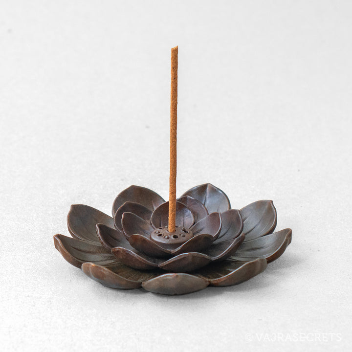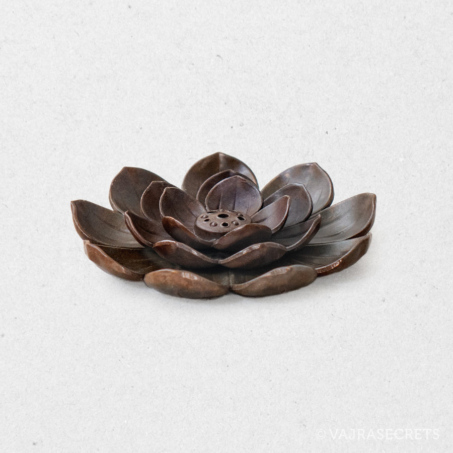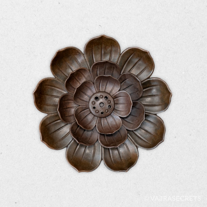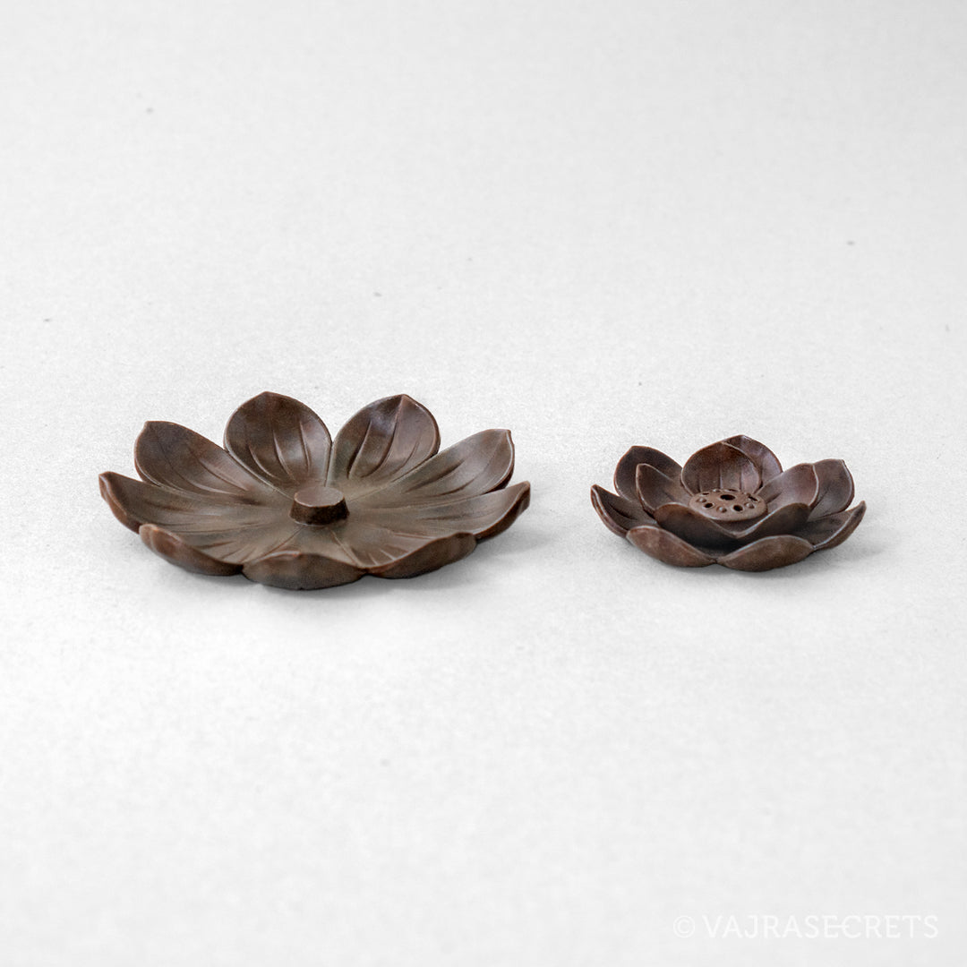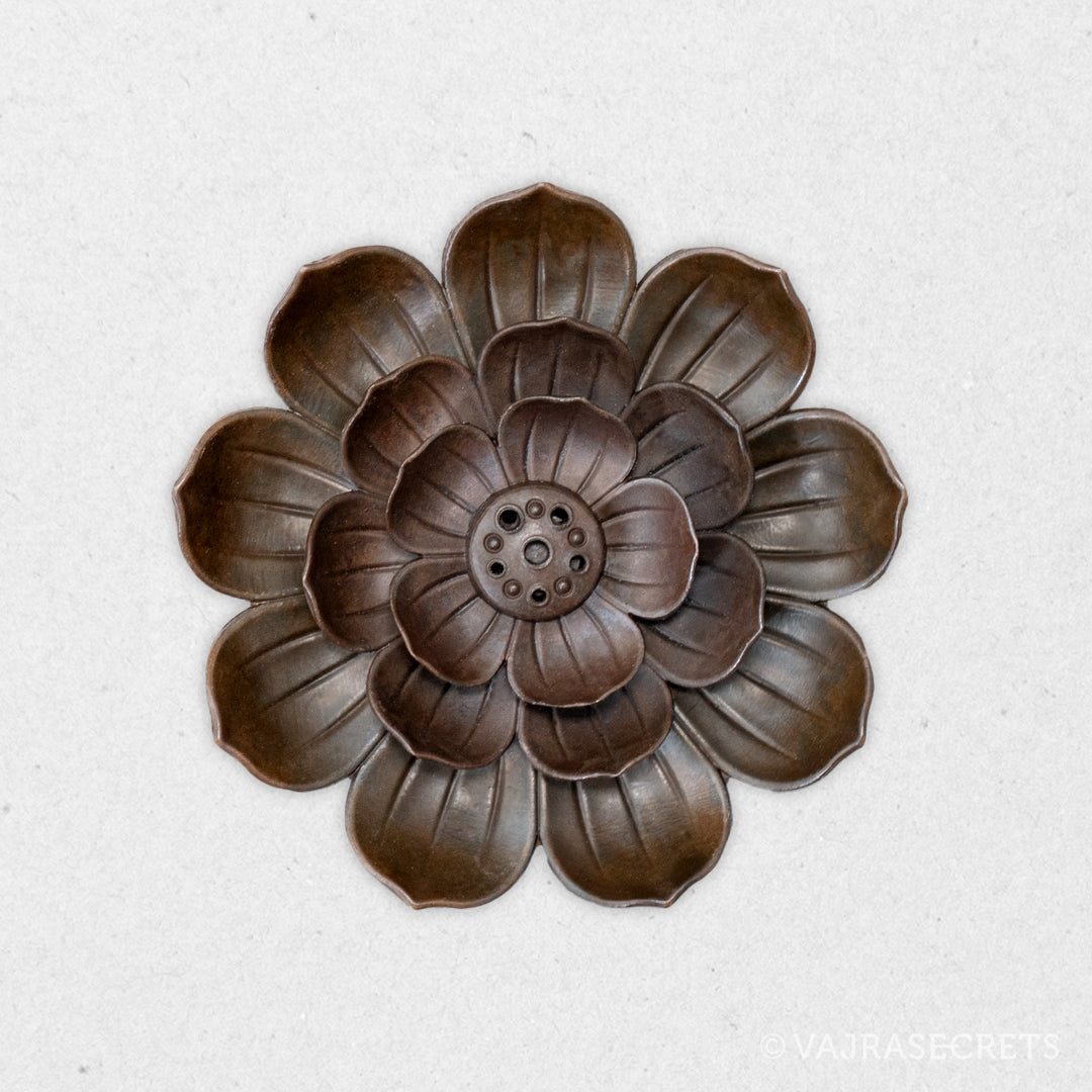 A classic lotus-shaped metal incense holder suitable for use with ultra slim, slim and regular thickness incense sticks. It will add oriental charm to any shrine or altar. The holder section in the middle is detachable for easy cleaning.