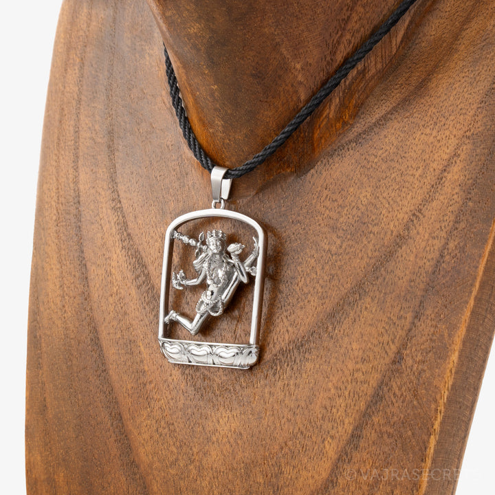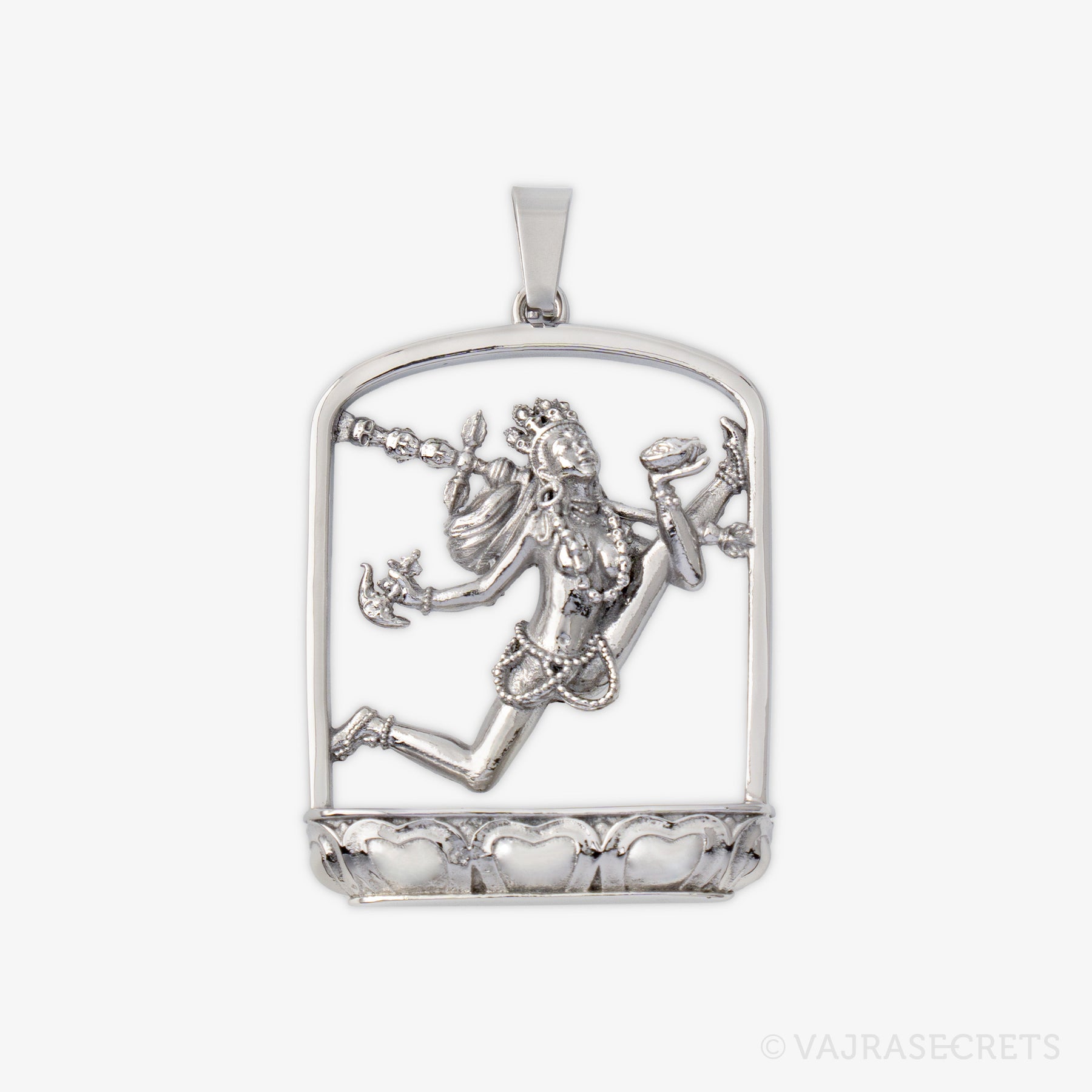 Her left leg is bent, stepping on the head and heart of the worldly deity Bhairava, representing the elimination of hatred and ignorance, while her right leg is straight, stepping on the breasts of Kalarati, representing the destruction of desire and its associated negative karmas.