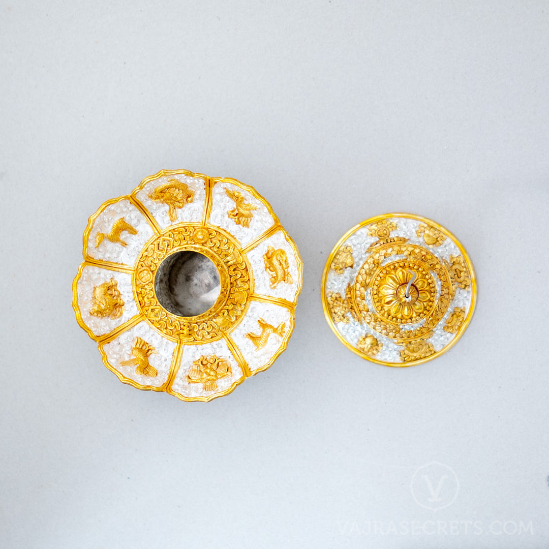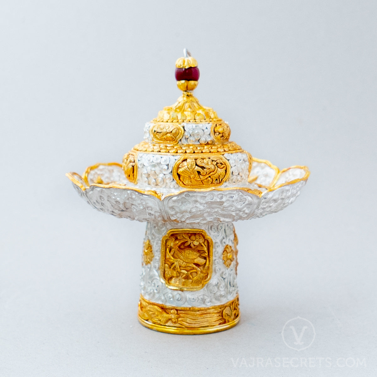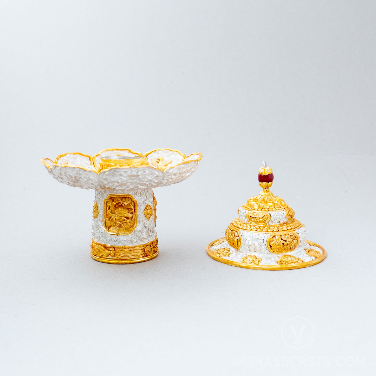 This handcrafted ceremonial lama cup stand consists of an eight-petaled lotus stand and matching cover. Also known as a dhakya set, it is suitable for making offerings to lamas during Buddhist ceremonies and rituals, or to your guru's image on your personal shrine.