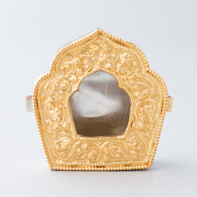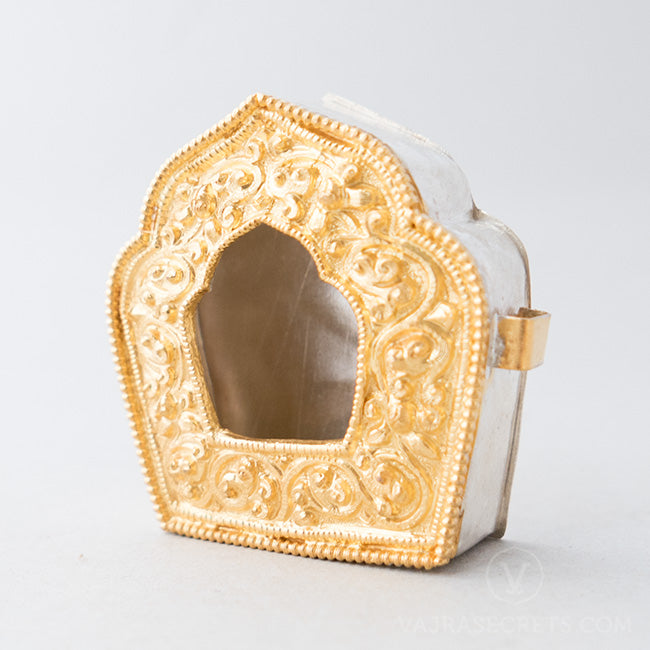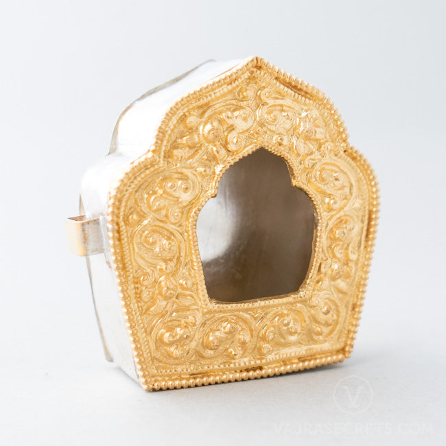 This traditionally-shaped Tibetan gau is handcrafted from copper by master Himalayan craftsmen and features a gold-plated front and silver-plated back and sides. Richly carved with ornate traditional motifs, this gau also features a large window that allows the items contained within to be viewed.