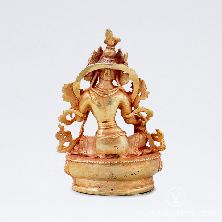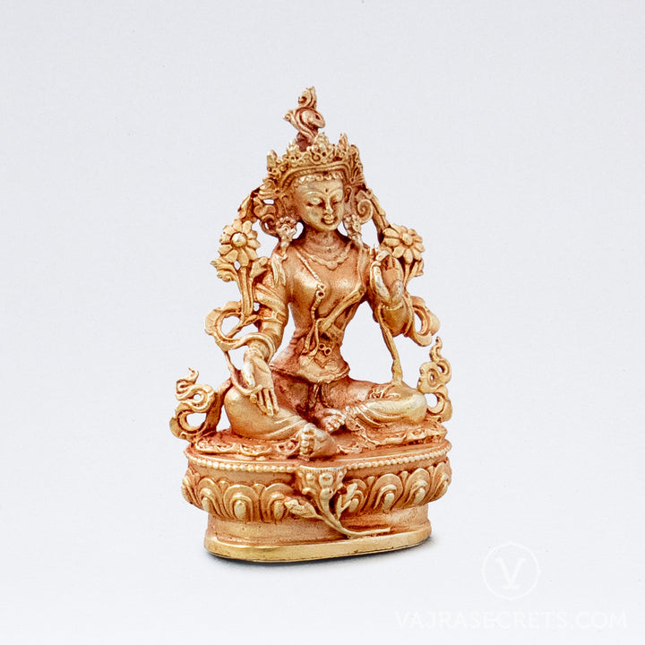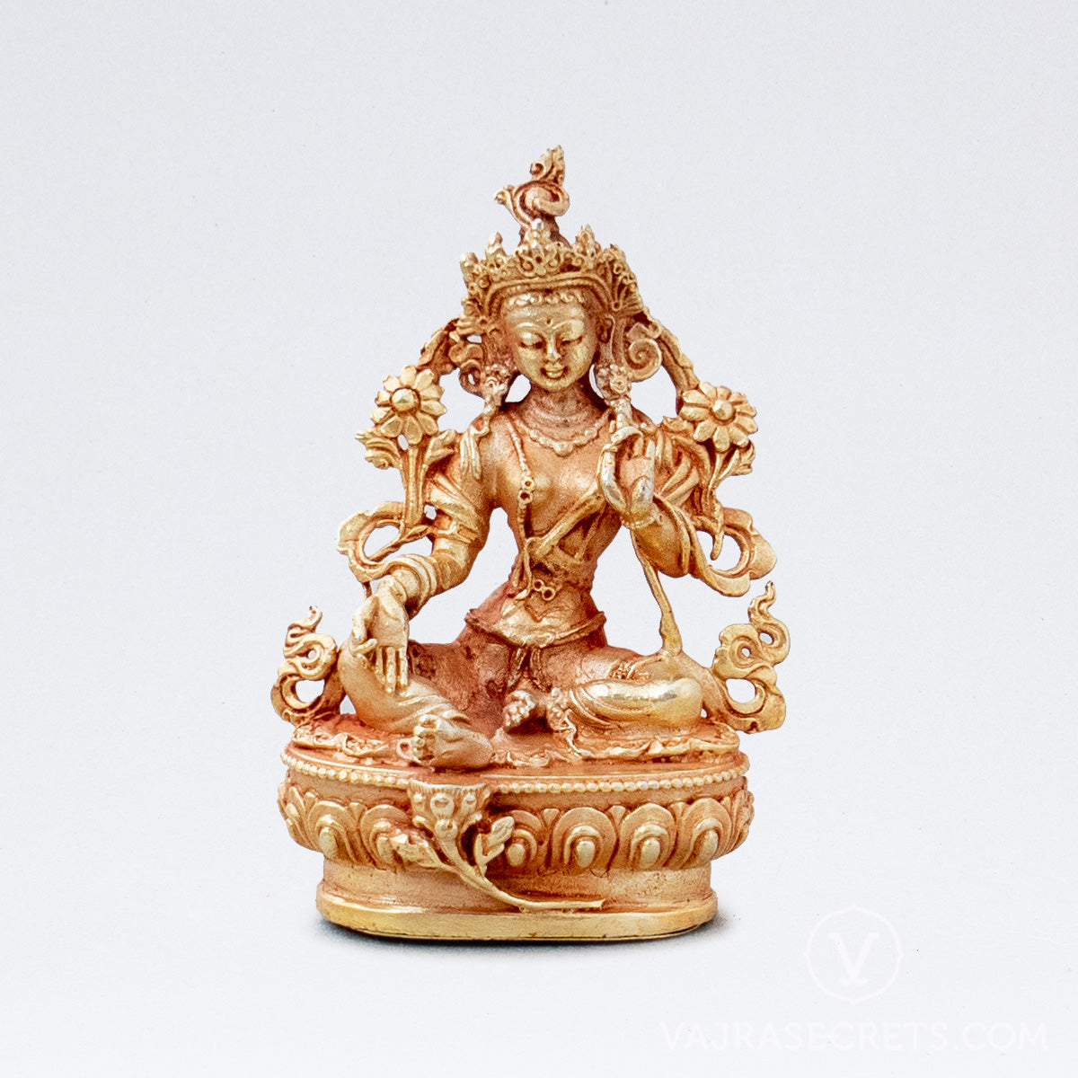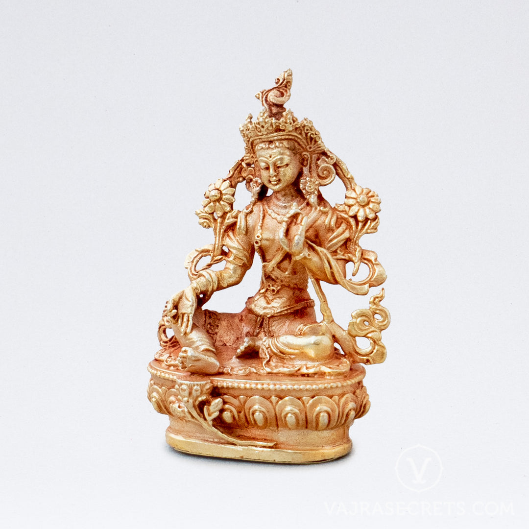 A miniature copper statue of Saviouress Green Tara, renowned for her swiftness in aiding those who sincerely invoke her in prayers. This Female Buddha is a firm favourite among Tibetan Buddhists. Suitable for small shrines at home, in the workplace, or as part of a portable travel altar.