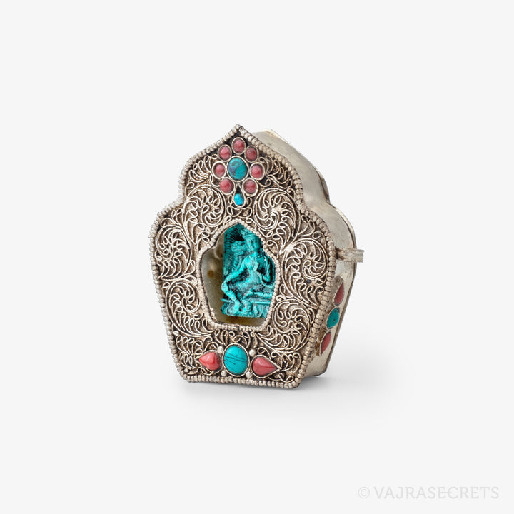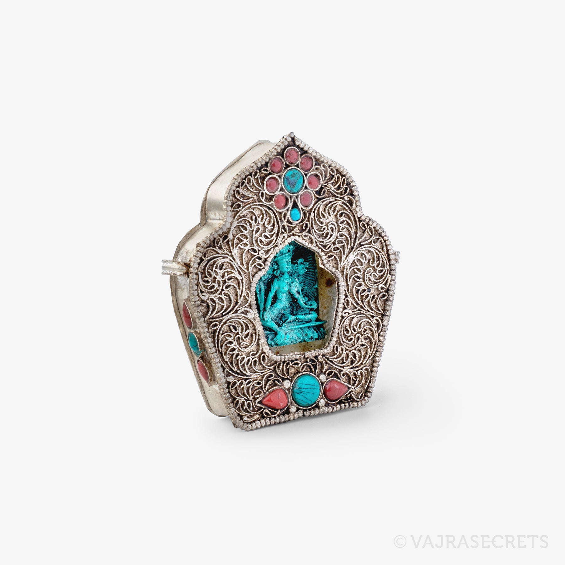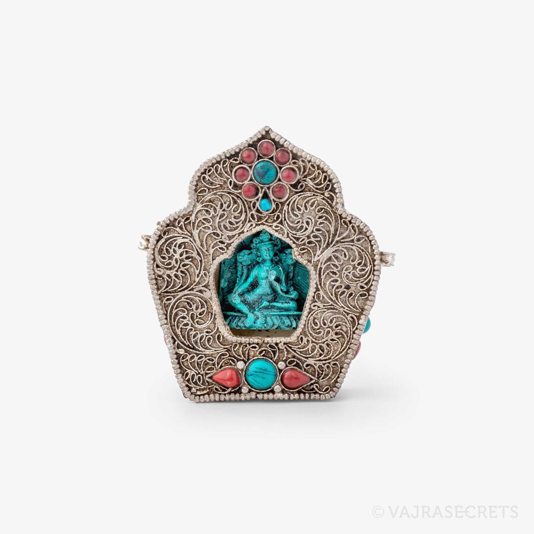 A gau locket of the Saviouress Green Tara, made with pressed turquoise powder and set in an ornate miniature gau. She is renowned for her swiftness in aiding those who sincerely invoke her in prayers, and is a firm favourite among Tibetan Buddhists.