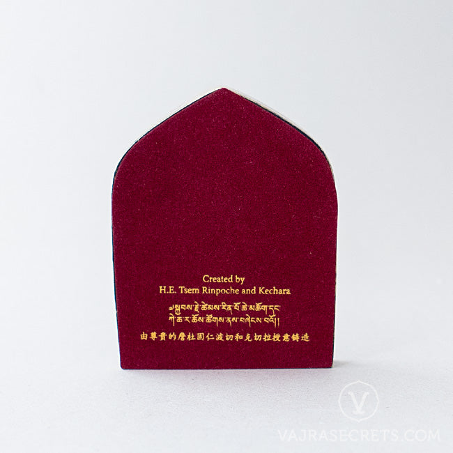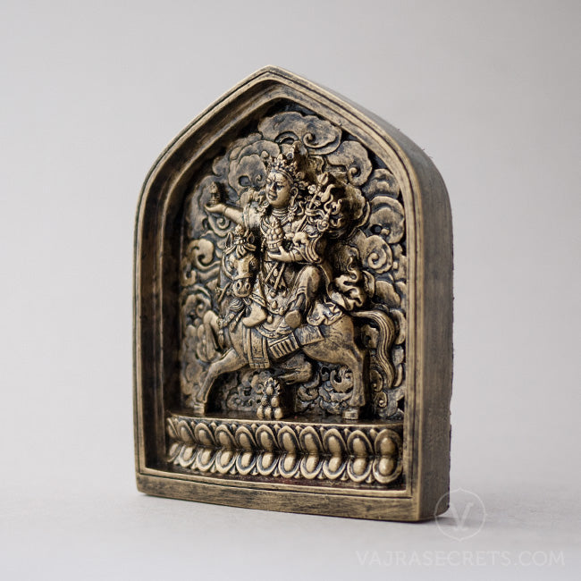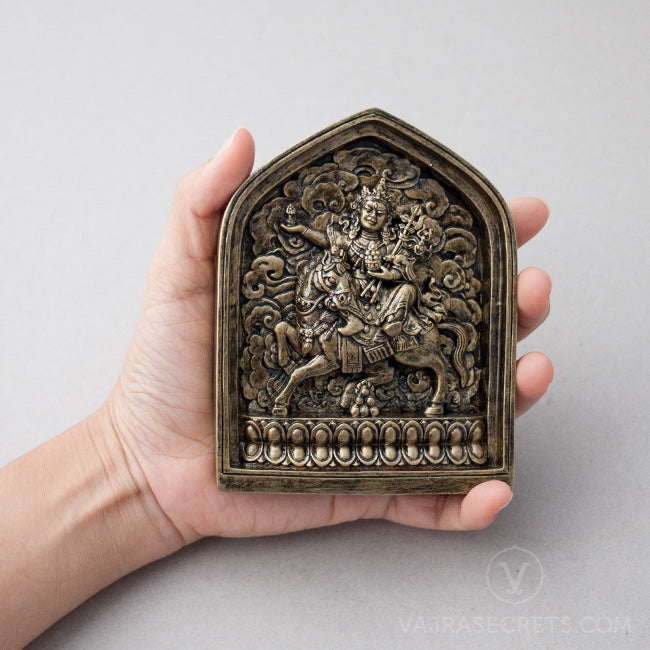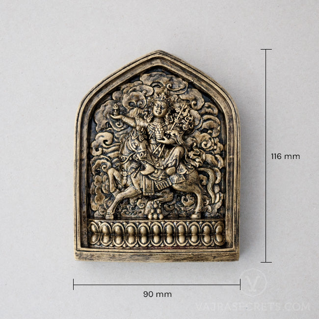An antique bronze finish resin tsa tsa of Gyenze, the "increase" form of Dorje Shugden, who is revered by many for his ability to increase material resources, lifespan, merit and realisations. His image also calms the immediate environment, helps overcome life's obstacles, and grants protection from negative energies.