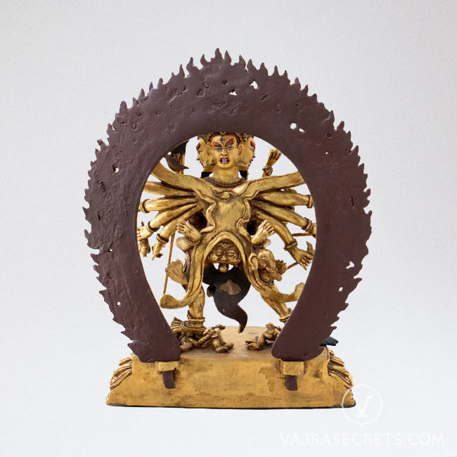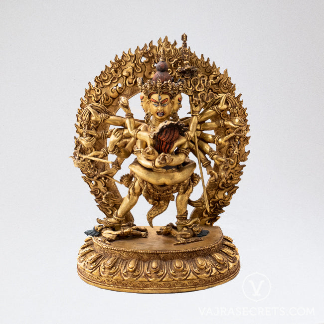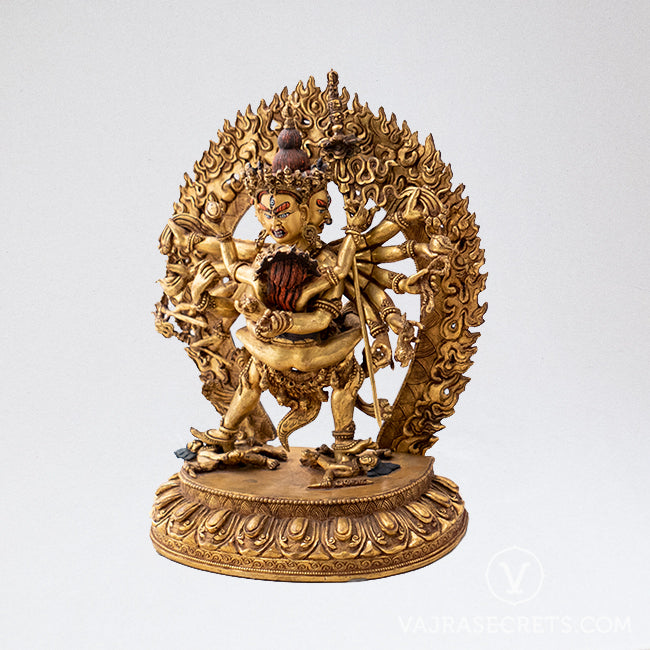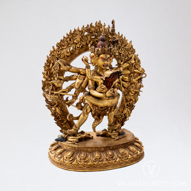 A handcrafted gold-plated statue of Tantric Buddha Heruka Chakrasamvara and his consort Vajrayogini, completed with hand-painted gold faces and wrathful deity features. Heruka Chakrasamvara is the ferocious emanation of Buddha Shakyamuni. His profound practice is amongst the highest tantras in Buddhism and is a quick way of achieving attainments and ultimately, enlightenment within a single lifetime. It is an excellent focal point and meditation aid for your daily practice.