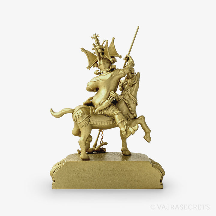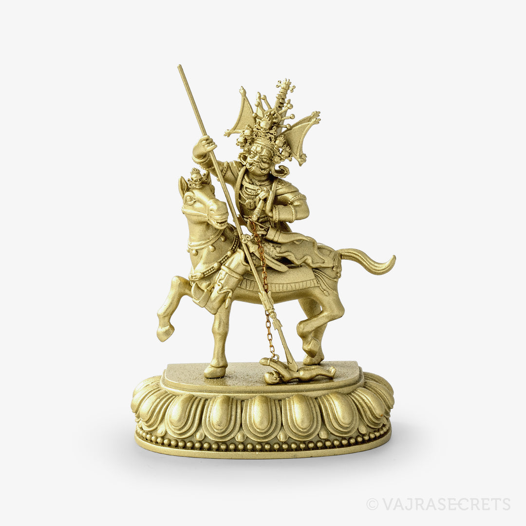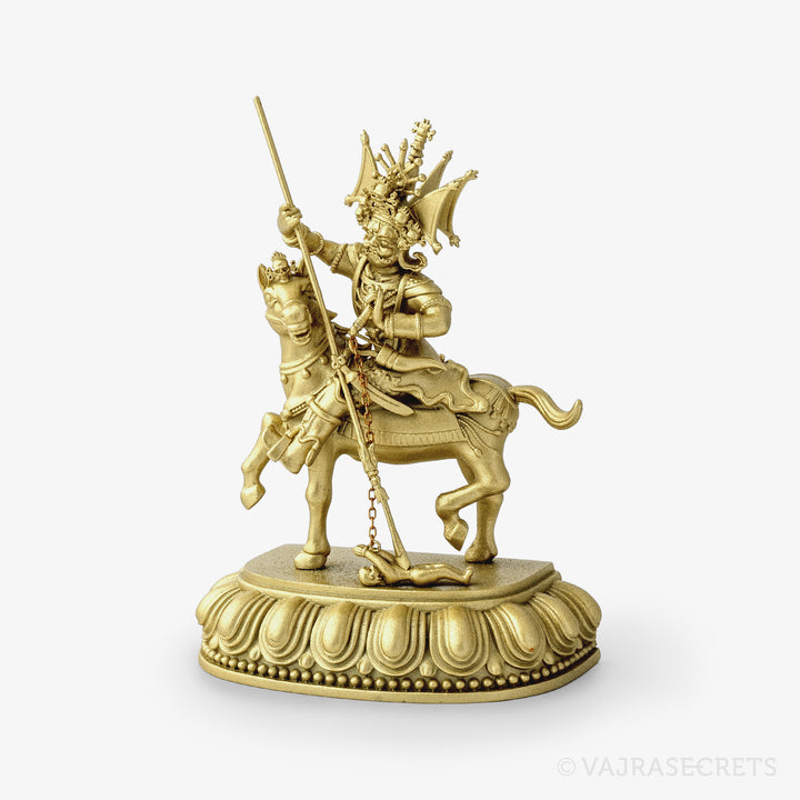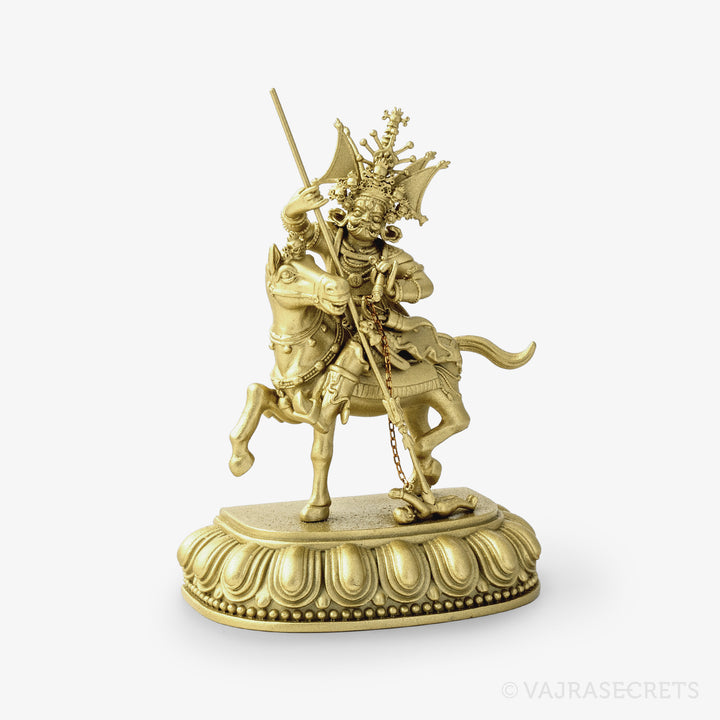 A gold-finish brass statue of Kache Marpo, the main "minister" of Dorje Shugden, revered by many for his ability to subdue inner and outer obstacles and grant protection from negative energies. Kache Marpo assists sincere practitioners along the spiritual path by subduing inner and outer obstacles. His image also calms the immediate environment. It is an excellent focal point and meditation aid for your daily practice.