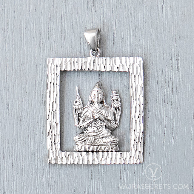 A delicate Lama Tsongkhapa mounted on a hollow square frame accented with diamond cut finish. From one of The Emptiness Collection, this pendant combines understated elegance with everyday wearability. Wear him close to your heart and be blessed with stabilisation of wealth, healing of depression and sickness, protection from negative energies, enhancement of intelligence, clarity of mind, deep joy and peace.