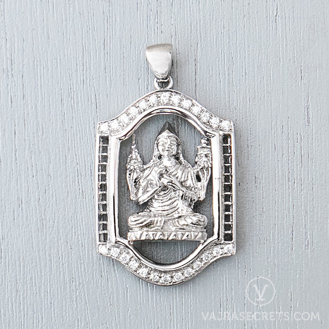A delicate Lama Tsongkhapa mounted on an ornate hollow frame and accented with cubic zirconia. Wear him close to your heart and be blessed with stabilisation of wealth, healing of depression and sickness, protection from negative energies, enhancement of intelligence, clarity of mind, deep joy and peace.