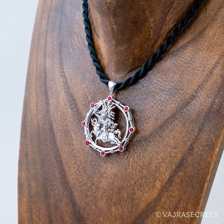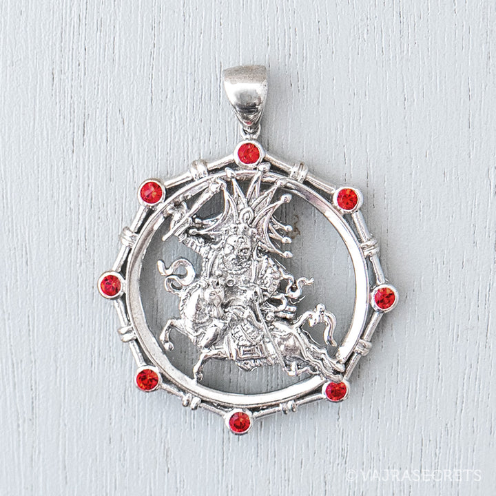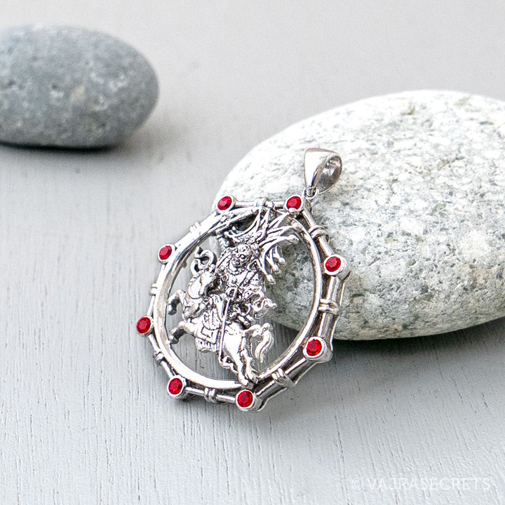 A limited edition 18k white gold vermeil Setrap pendant mounted on an octagonal frame and accented with red cubic zirconia. Wear him close to your heart and be blessed with protection from unseen harm and negative entities, and brings swift assistance for life's daily challenges.