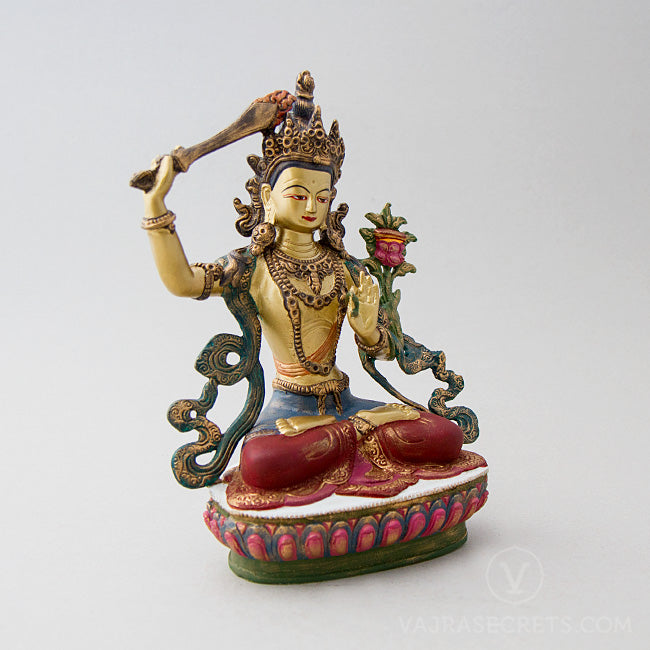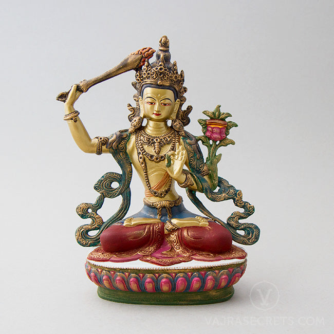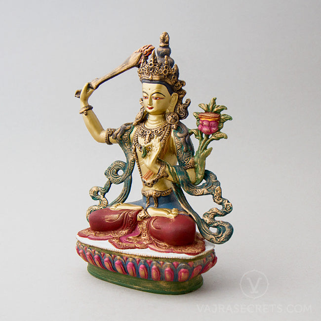 A colourful brass statue of Wisdom Buddha Manjushri, who brings deeper understanding, improved memory, better communication skills and mental development. He is very beneficial for students and children, for people in the education and communication industries, and for anyone seeking greater wisdom. It is an excellent focal point and meditation aid for your daily practice.
