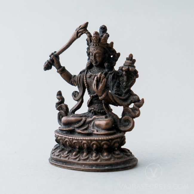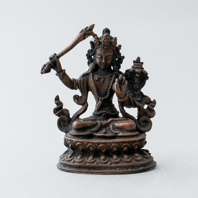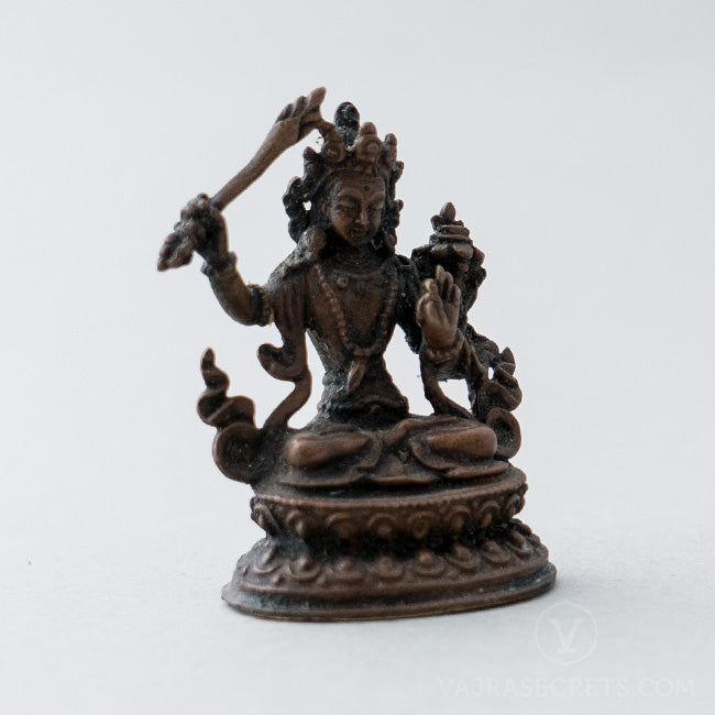 A miniature copper statue of Wisdom Buddha Manjushri, who brings deeper understanding, improved memory, better communication skills and mental development. He is very beneficial for students and children, for people in the education and communication industries, and for anyone seeking greater wisdom. Suitable for small shrines at home, in the workplace, or as part of a portable travel altar.