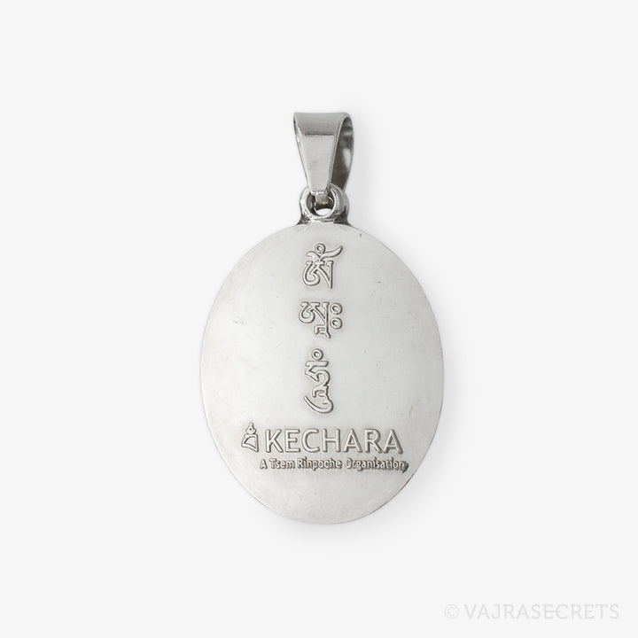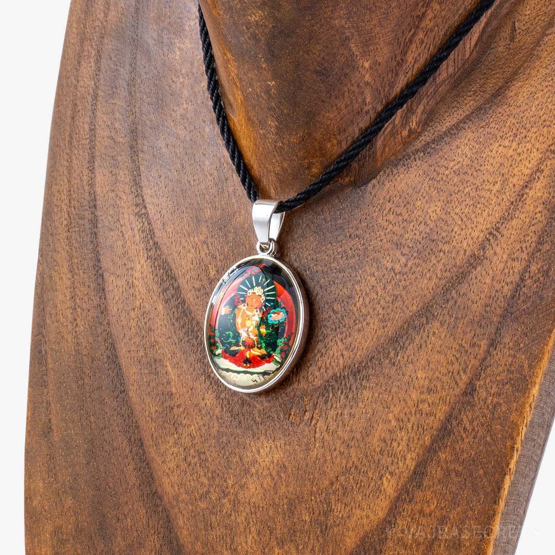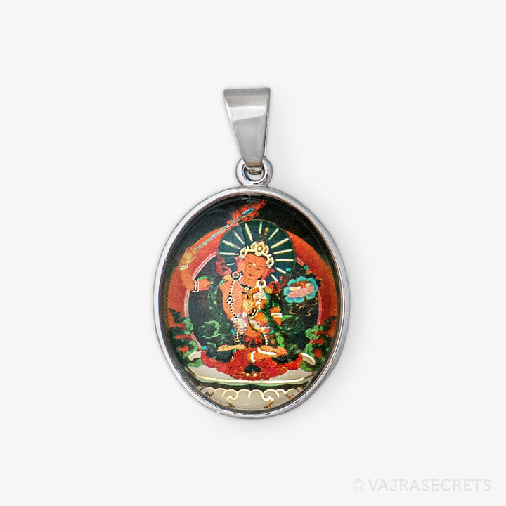 Bring Manjushri's blessings and protection everywhere you go with this casual and affordable glass dome pendant with gold foil accents. Wear him close to your heart and be blessed with deeper understanding, improved memory, better communication skills, and the development of your mind.