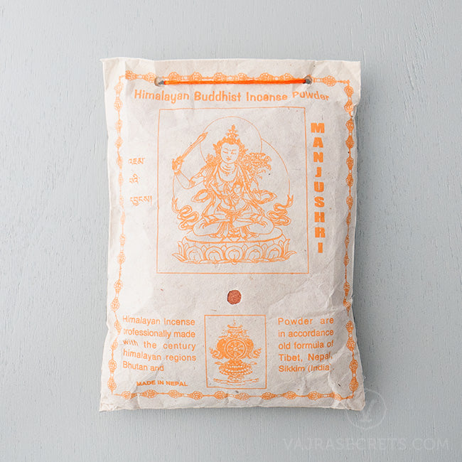 Manjushri Tibetan Incense Powder is handmade from medicinal herbs, oils, resins and spices from the Himalayan mountains, following a strict formula found in ancient scriptural texts. When burnt, it releases a mellow and woody aroma.