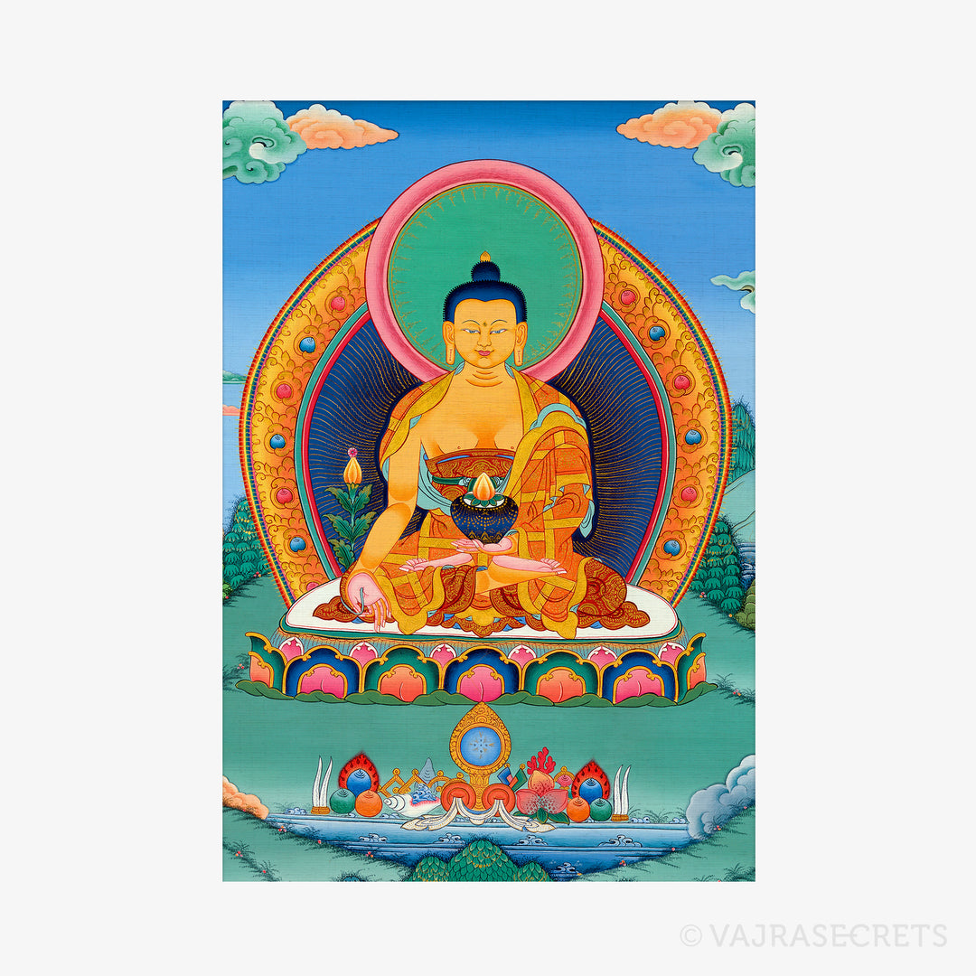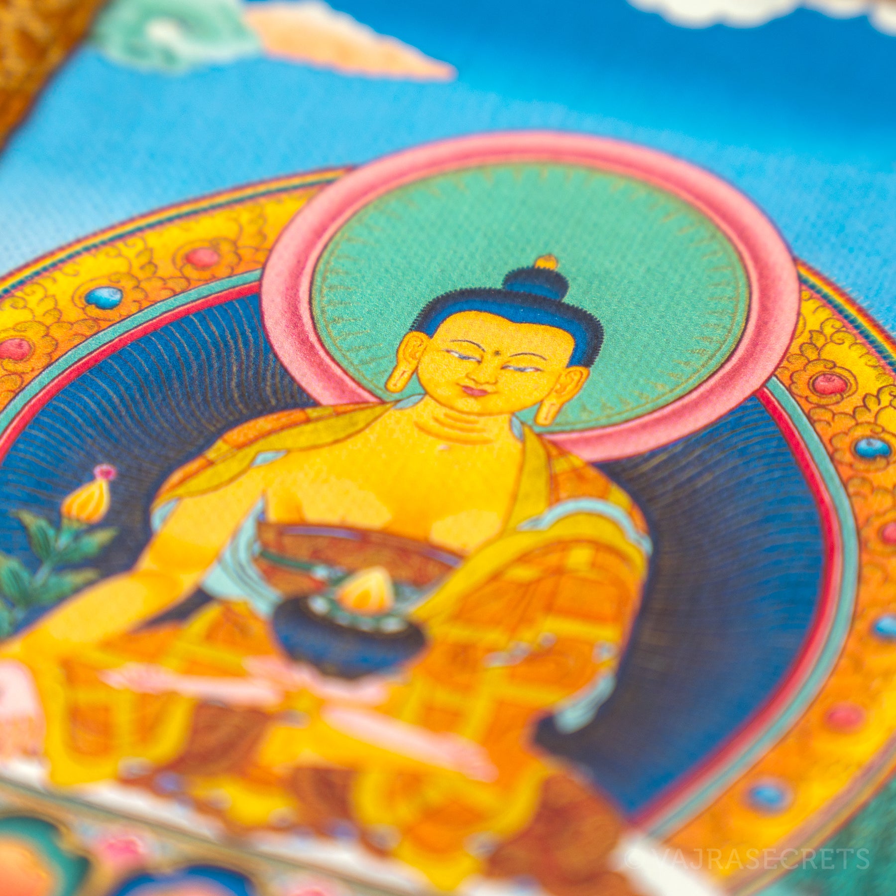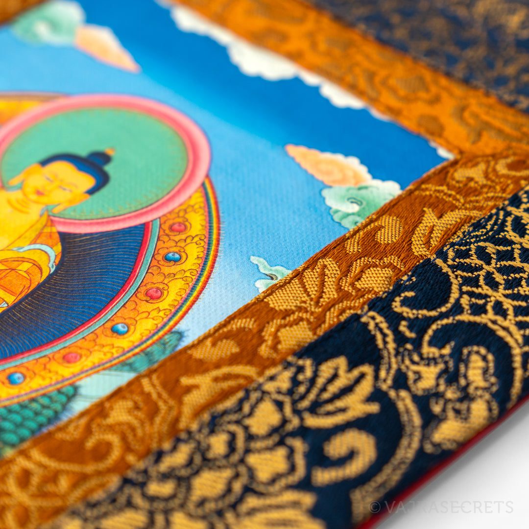 A miniature thangka of the supreme healer Medicine Buddha, featuring a high quality giclée canvas print and mounted on a rich brocade frame. Known for healing illnesses, averting disease and purifying body karma, he is particularly beneficial for anyone in need of accurate diagnosis and effective treatment, as well as people in the healing profession. Well-suited for a travel altar or compact workplace shrine.