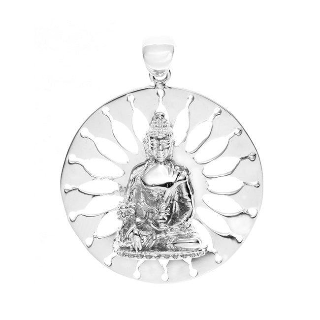 An elegant Medicine Buddha mounted on a disc backing accented with a sunburst motif. Wear him close to your heart and be blessed with good health, swift recovery, and protection from illnesses and diseases. It is especially beneficial for people in the healing profession (doctors, nurses, surgeons, healers, psychologists, etc.) and also for people seeking doctors, treatment, diagnosis, and effective medicine.