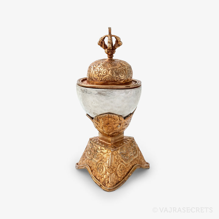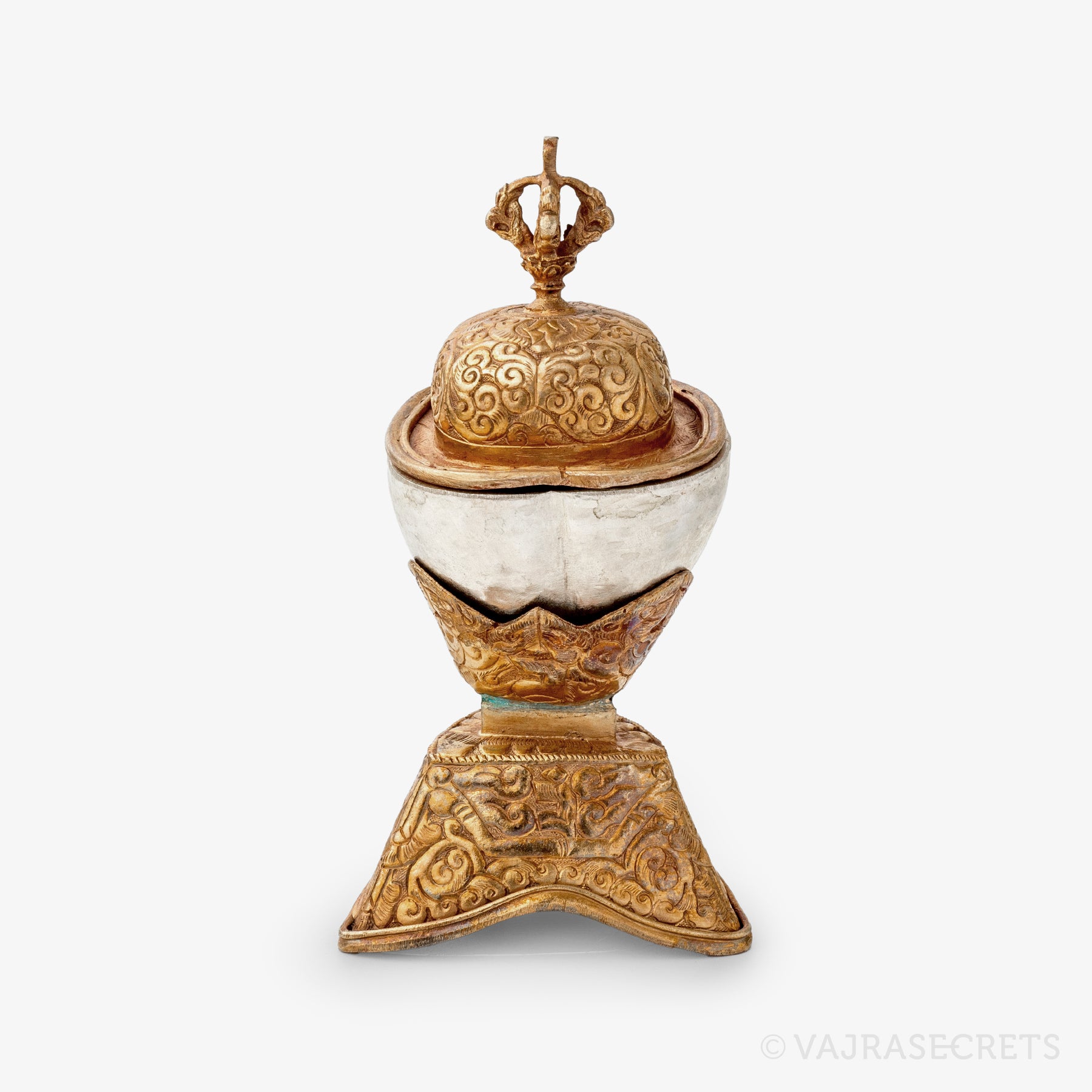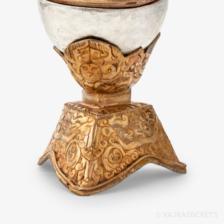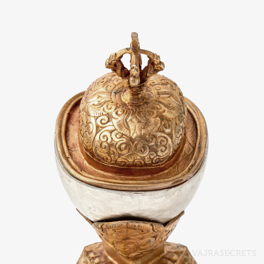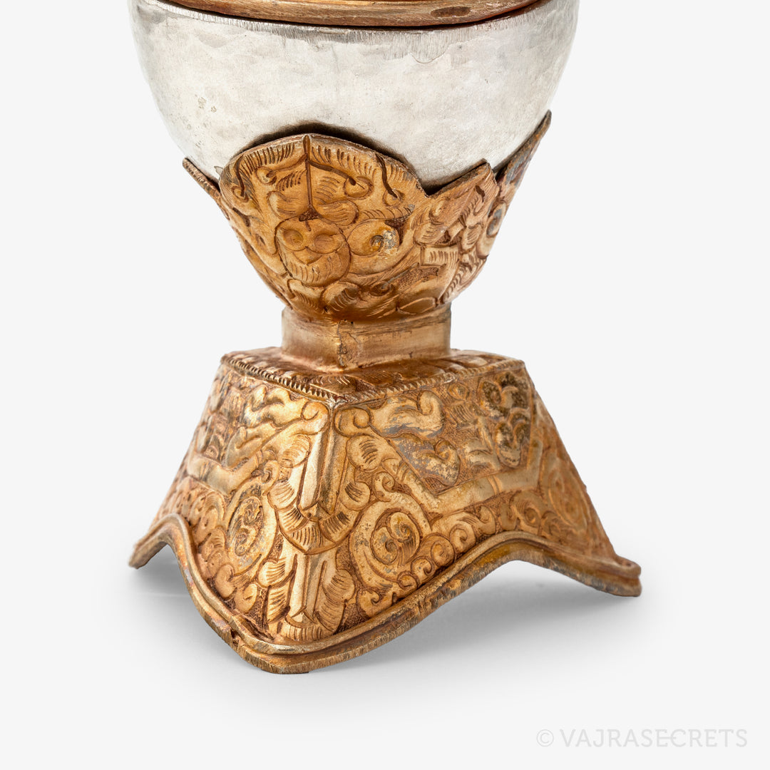 A handcrafted gold and silver plated kapala (skull cup) with Tibetan-style carvings on the cover and stand. It is most commonly used as a vessel for the practitioner's 'inner offering', made from either alcohol or black tea mixed with nectar pills. It can also be used to hold ritual cakes and other tantric offerings.