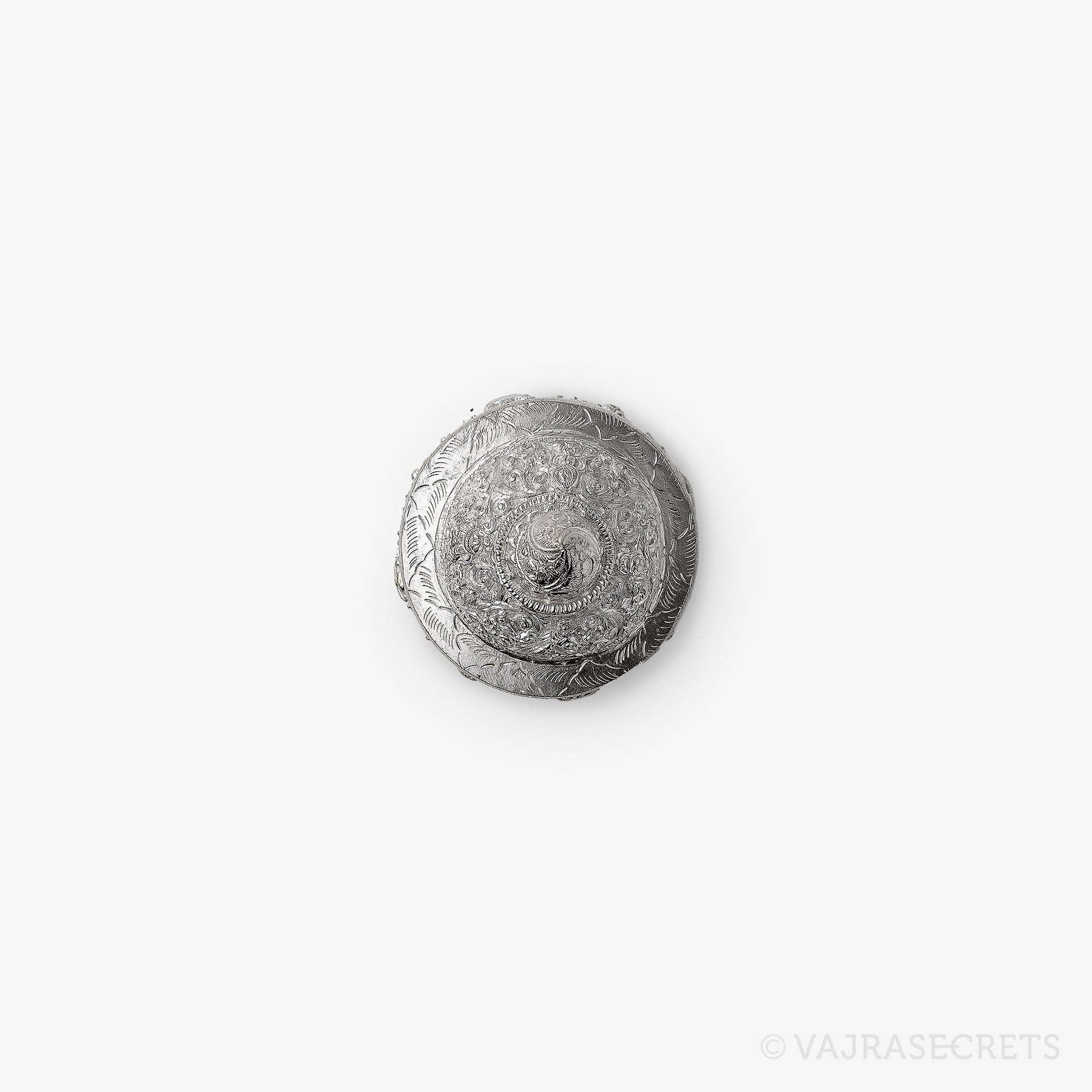 A handcrafted copper Ritual Rice Pot with a silver-plated finish and rich carvings of Tibetan motifs. It is used as a vessel for raw rice, barley or other ritual substances required during pujas and ceremonies. Suitable for practitioners of all levels.