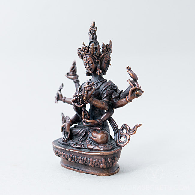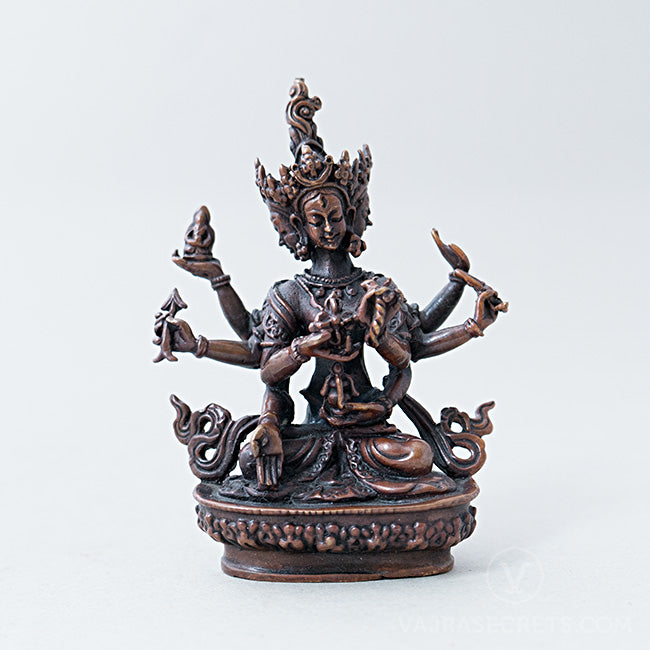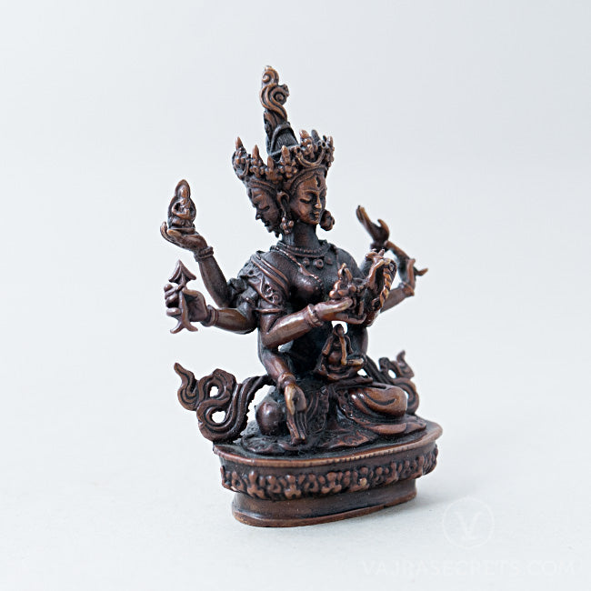 A handcrafted copper statue of the Long Life Buddha, Namgyalma, who bestows longevity and healing on those who seek her blessings for the purposes of attaining Enlightenment and benefiting others. It is an excellent focal point and meditation aid for your daily practice.