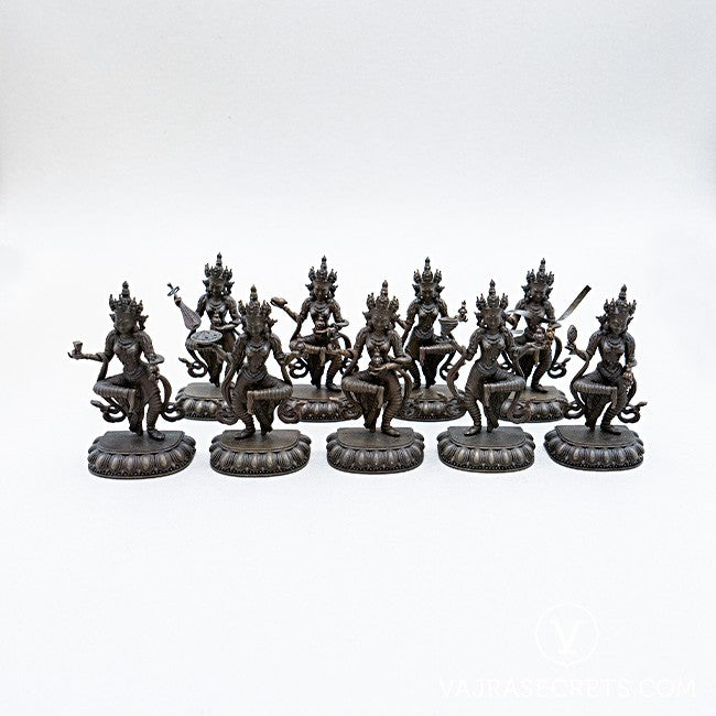 Invite the full set of Nine Great Mothers who personify the Goddesses of the Four Elements and Five Senses into your personal worship or meditation space. Offering representations of a deity's retinue is symbolic of your request for swift activity. Hence, placing these images of Dorje Shugden's entourage on your protector shrine creates the causes for Dorje Shugden to swiftly lend his assistance and answer your prayers.