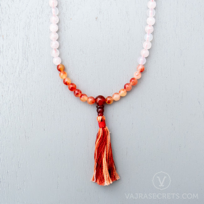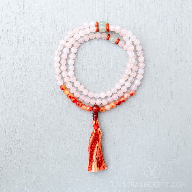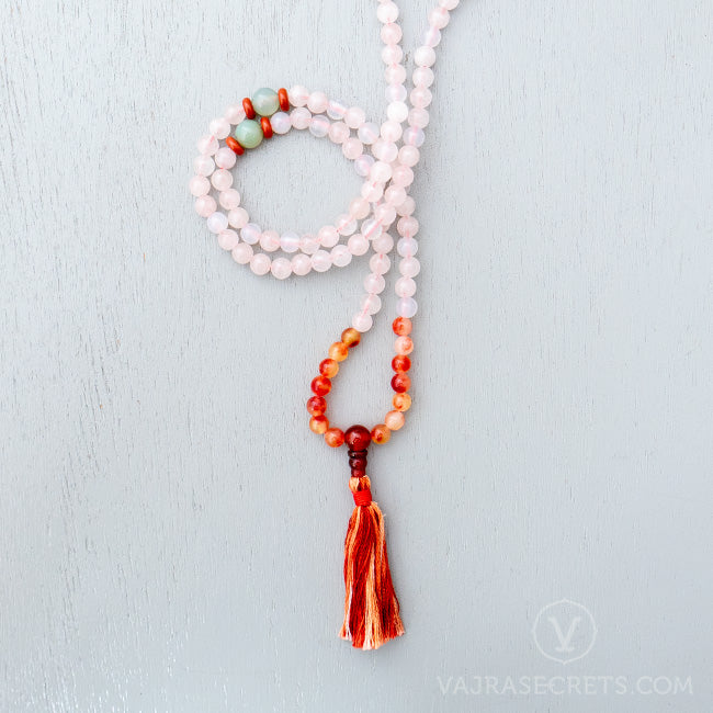 A Tibetan-style mala (prayer beads or Buddhist rosary) made from 108 rose quartz and multicoloured agate beads, with crystal dividers and stone spacers, the Pure Love Mala reminds us to give love to all sentient beings and to be open to receiving love.