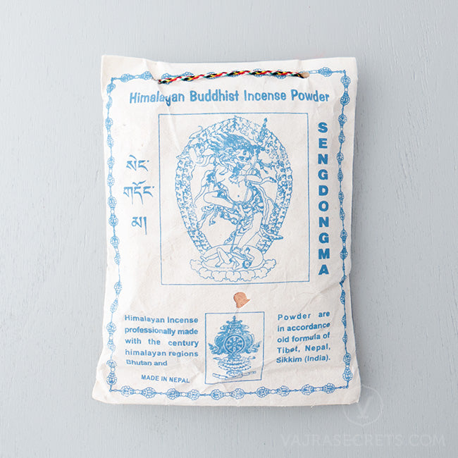 Sengdongma Tibetan Incense Powder is handmade from medicinal herbs, oils, resins and spices from the Himalayan mountains, following a strict formula found in ancient scriptural texts. When burnt, it releases a woody and floral aroma.