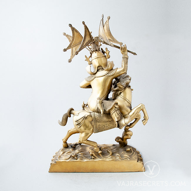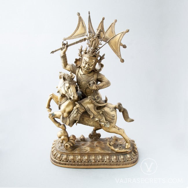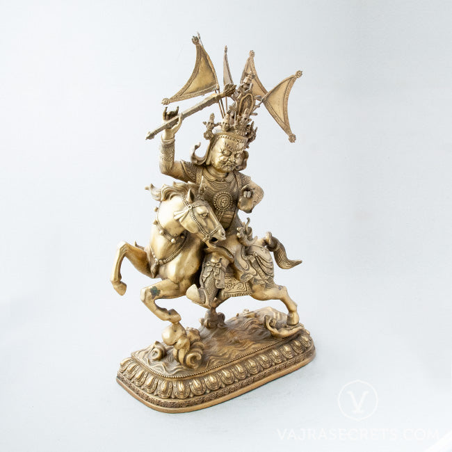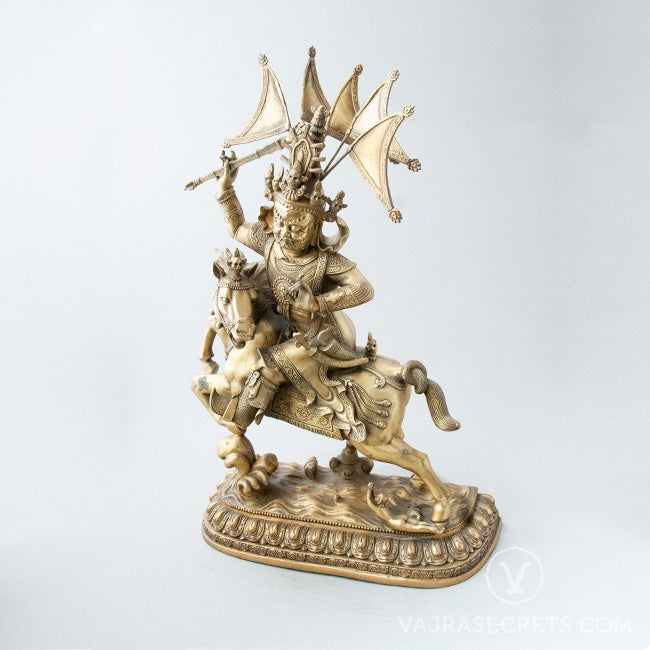 A gold-finish brass statue of the Dharma Protector Setrap, who is the wrathful emanation of Buddha Amitabha. His image grants powerful protection from negative energies and black magic, provides swift assistance to overcome life's problems, and helps us along our spiritual journey. It is an excellent focal point and meditation aid for your daily practice.