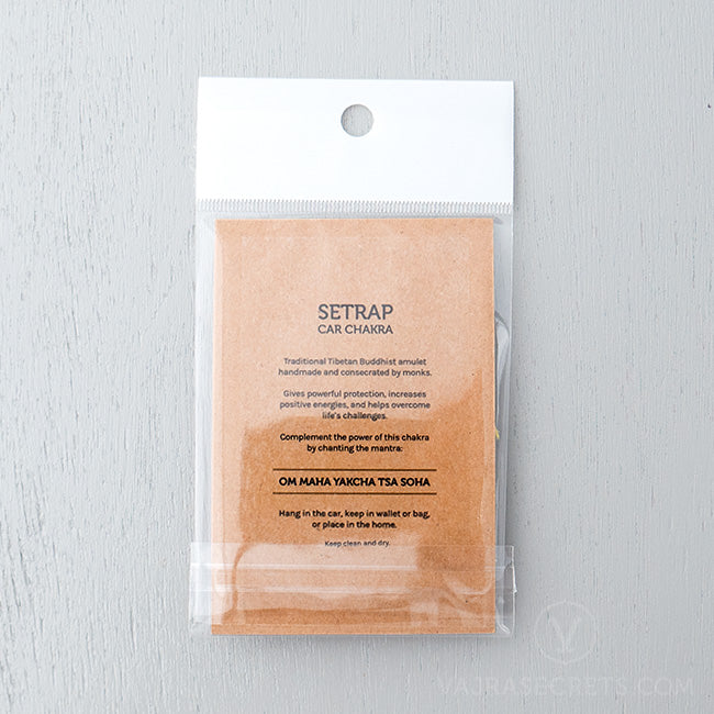 This traditional Tibetan Buddhist amulet containing the essence, power and protective energies of the enlightened Dharma Protector Setrap Chen, who is the wrathful emanation of Amitabha Buddha. Handmade and consecrated by monks of Gaden Shartse Monastery, this limited-edition Setrap Car Chakra is perfect for all types of travels, granting protection, blessings and peace of mind. It is also very effective for problems related to black magic and negative interferences and is highly recommended for those who reside in or travel to dangerous places. It also bestows powerful protection against black magic and spirit harm, increases positive energies, and helps overcome life's challenges.