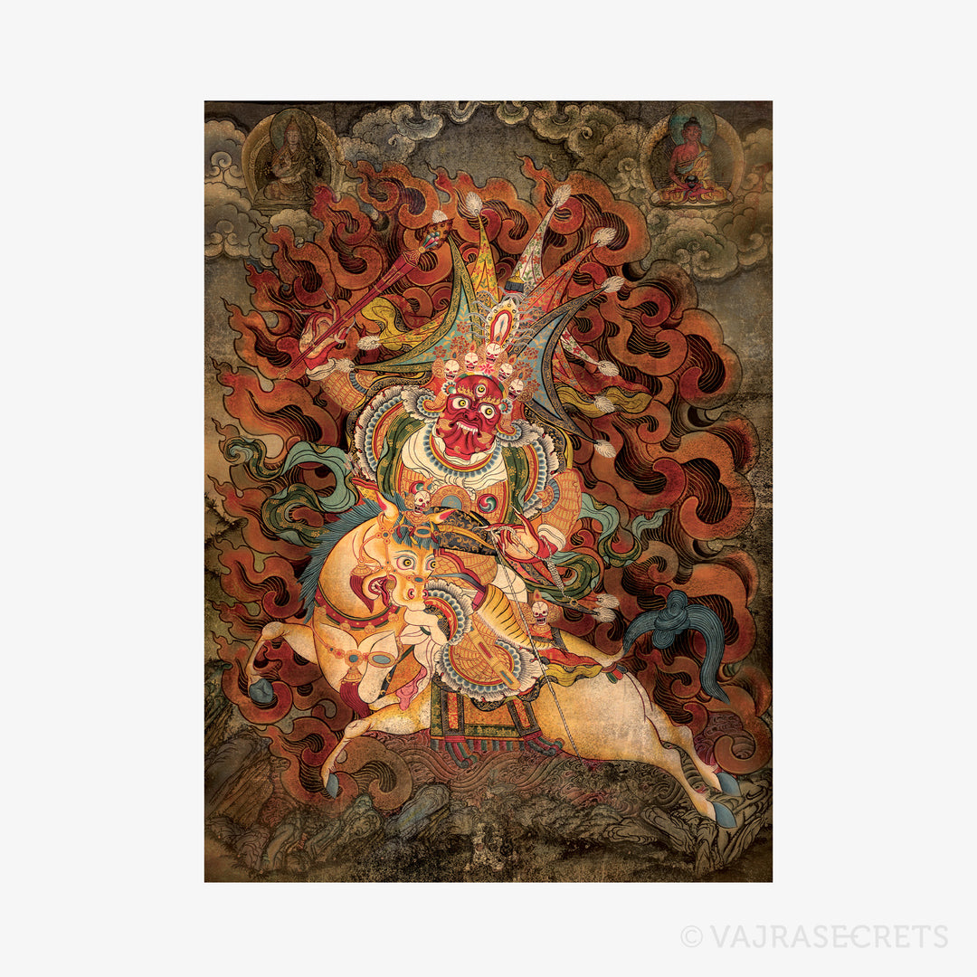 A high-quality, vintage-style thangka print of Dharma Protector Setrap, the wrathful emanation of Buddha Amitabha, who is extremely efficacious for clearing obstacles towards our spiritual practice. He grants protection from black magic. Having an image of him close to us or in our homes bestows immense blessings and protection on our surroundings and ourselves.