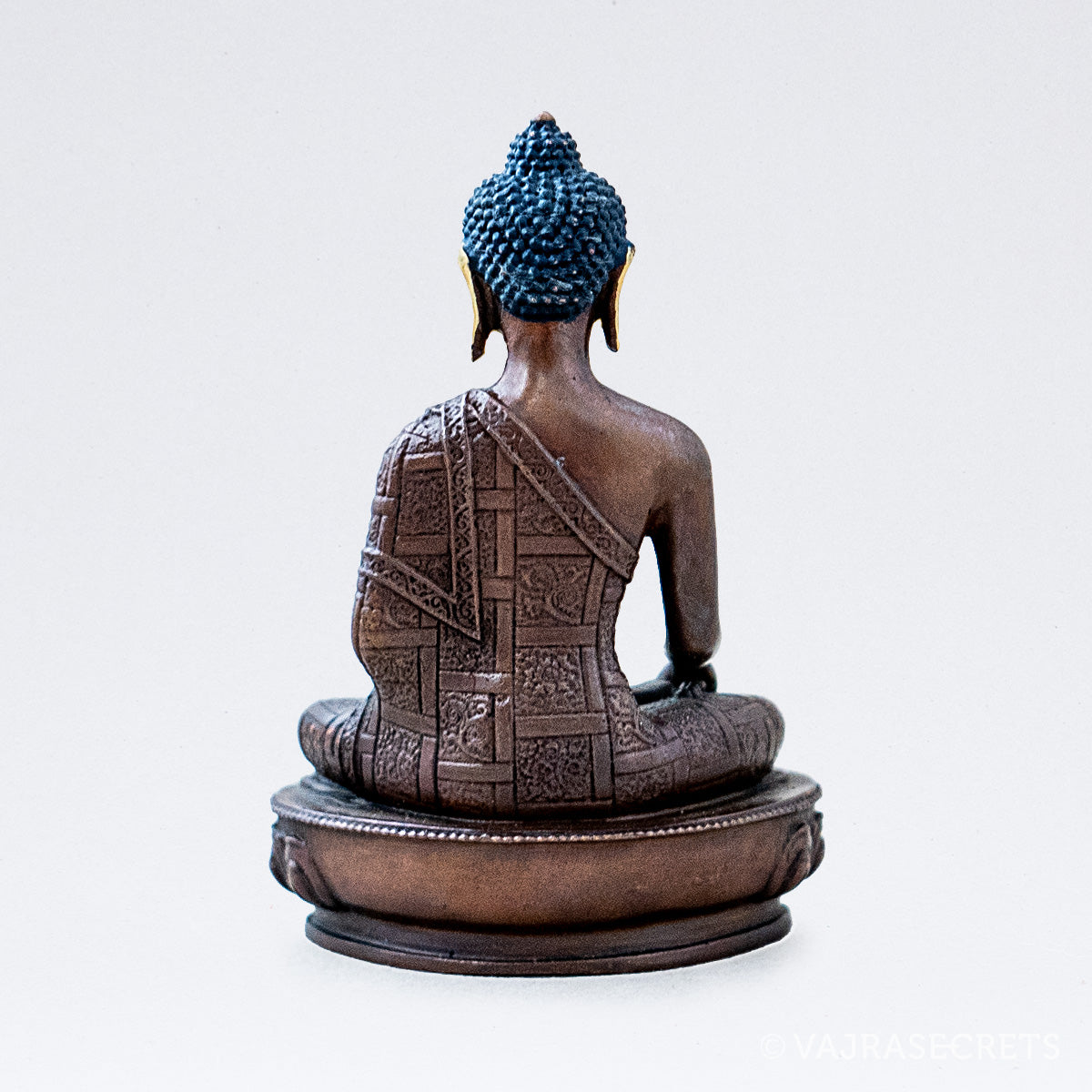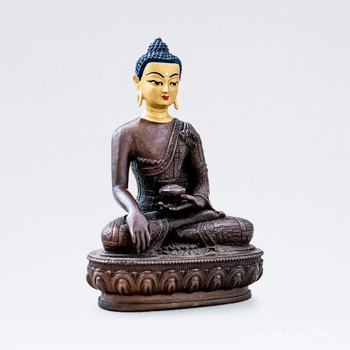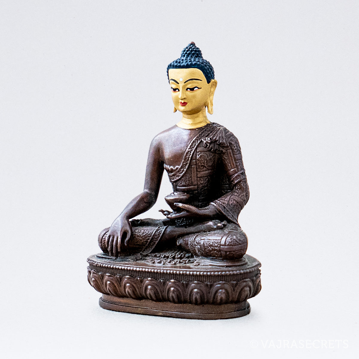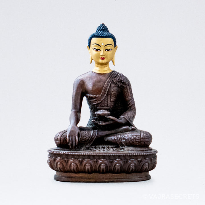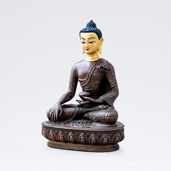 A miniature copper statue of The Awakened One, Buddha Shakyamuni, complete with a hand-painted gold face and delicate deity features. Buddha Shakyamuni taught 84,000 methods to Enlightenment to suit all possible dispositions and levels of spiritual seekers. Suitable for small shrine at home, in the workplace, or as part of a portable travel altar.