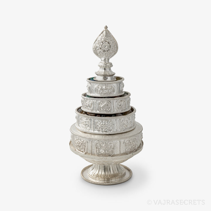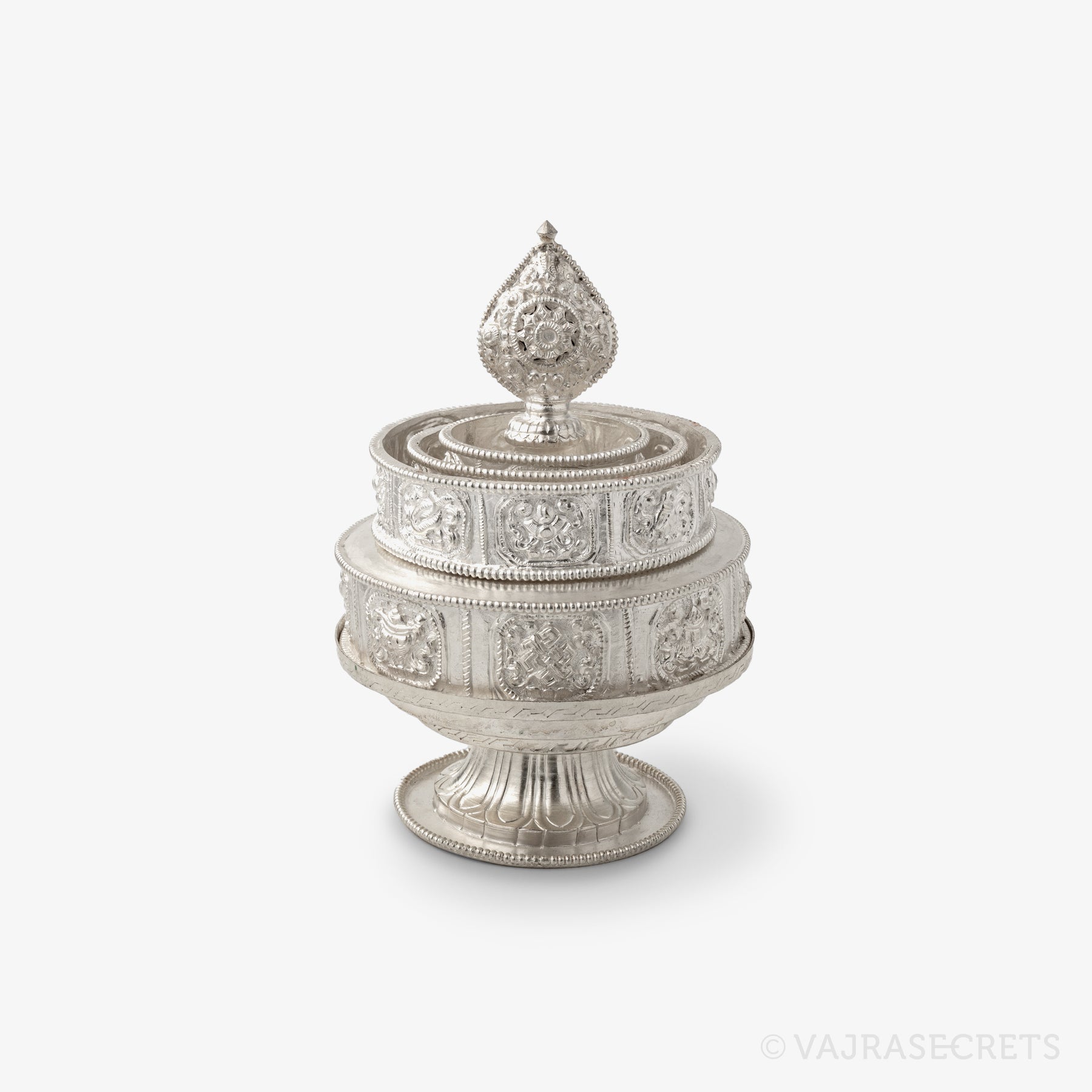 A traditional multi-tiered mandala offering set, handcrafted from copper and featuring intricate carvings of the Eight Auspicious Signs and other Tibetan motifs. Representing all that is beautiful and precious in the universe being offered up to the Buddhas, mandala offerings generate immense merits that will help propel you towards Enlightenment.