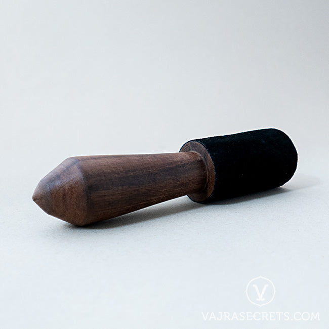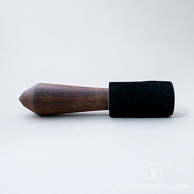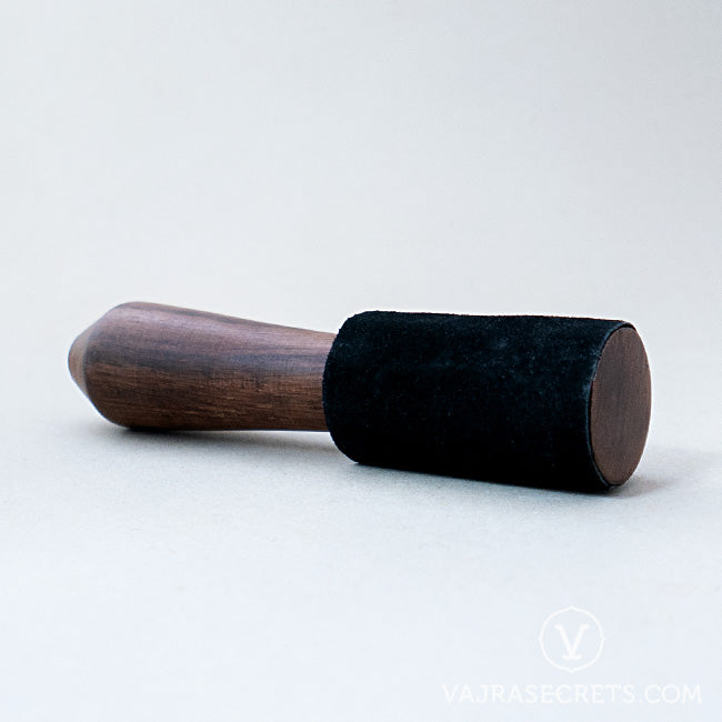 A medium-sized suede-wrapped wooden ringing stick for use with medium to large singing bowls. It can be used for both the striking and rimming methods of playing, and the soft suede surface produces less-harsh, more ethereal sounds while the wooden surface produces higher and brighter tones.