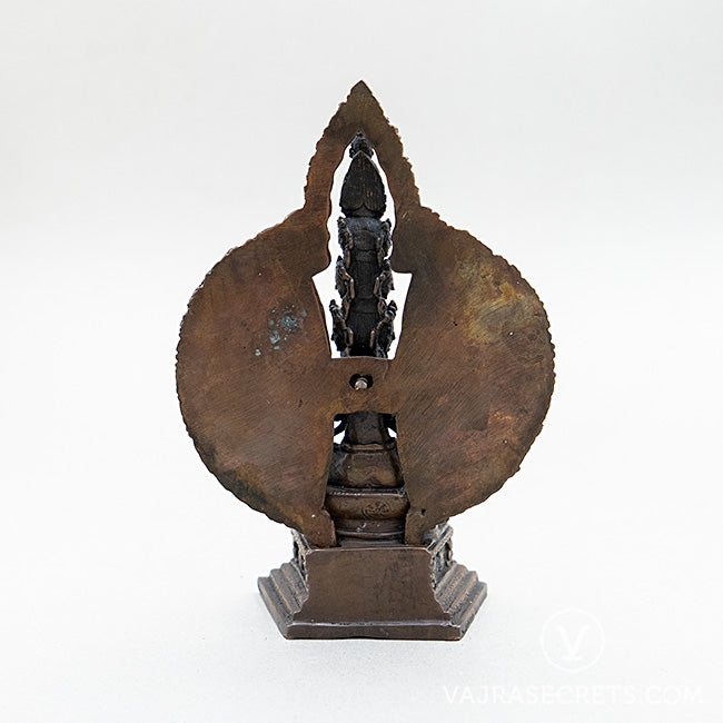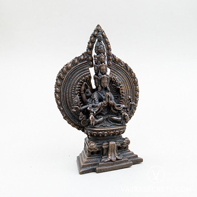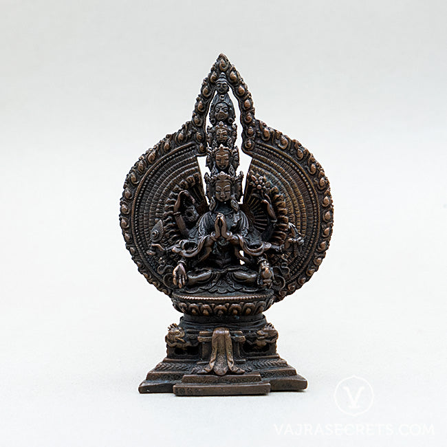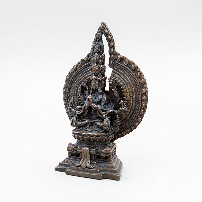 An oxidised-finish statue of 1000-Armed Chenrezig in a unique sitting position, crafted with full iconographic detail according to traditional scriptural sources. Suitable as an object of veneration for a home shrine or workplace altar, and for anyone who would like to tap into Chenrezig's compassionate and peaceful energies. It is an excellent focal point and meditation aid for your daily practice.