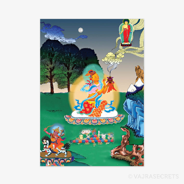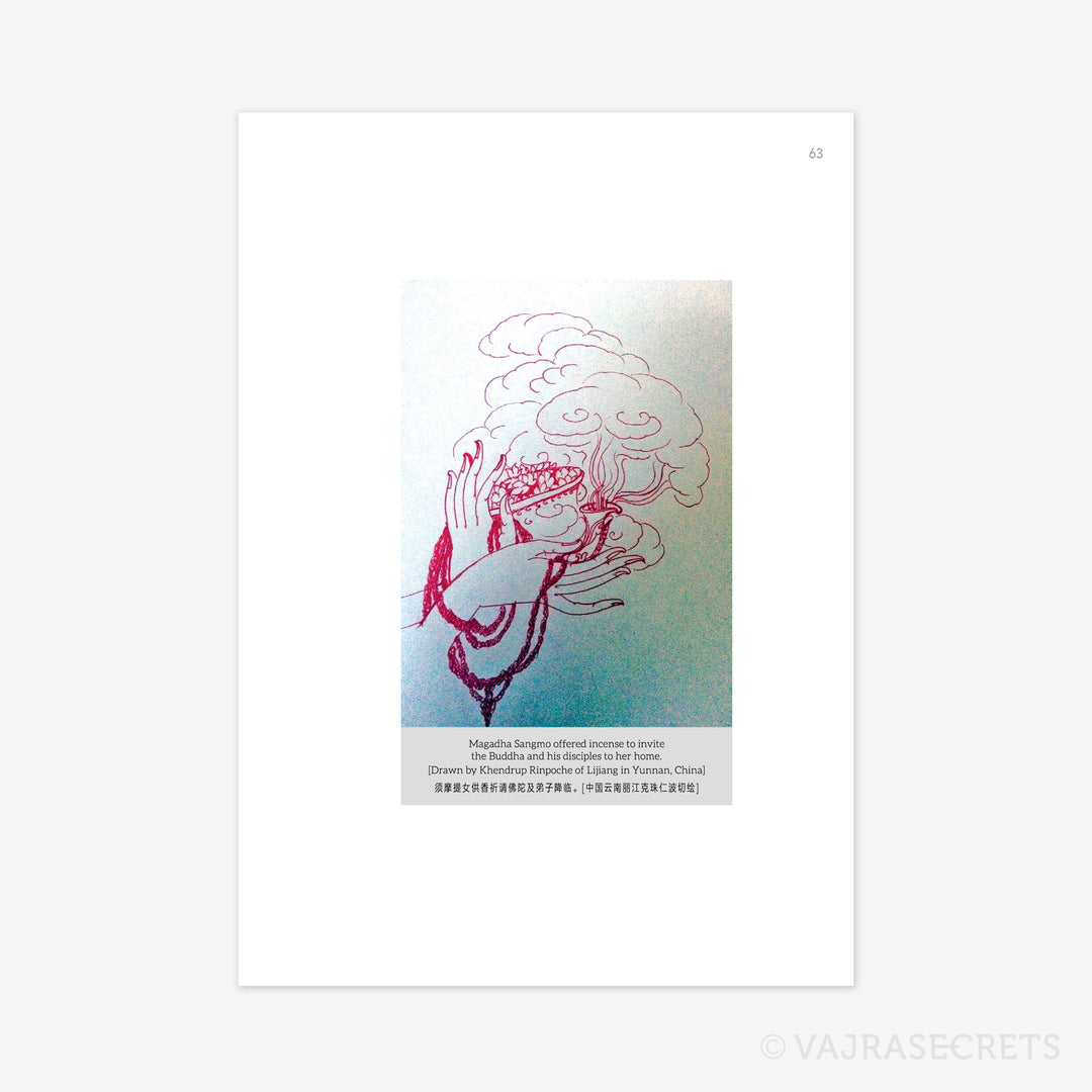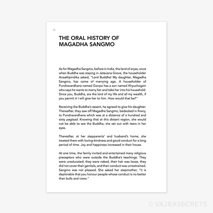 Magadha Sangmo, a female devotee of the historical Buddha Shakyamuni, was known for her unwavering devotion to her spiritual teacher. During her lifetime, she brought a great many people onto the path of Dharma and began the tradition of invocation prayers that are still recited to this day in Tibetan Buddhist monasteries around the world.