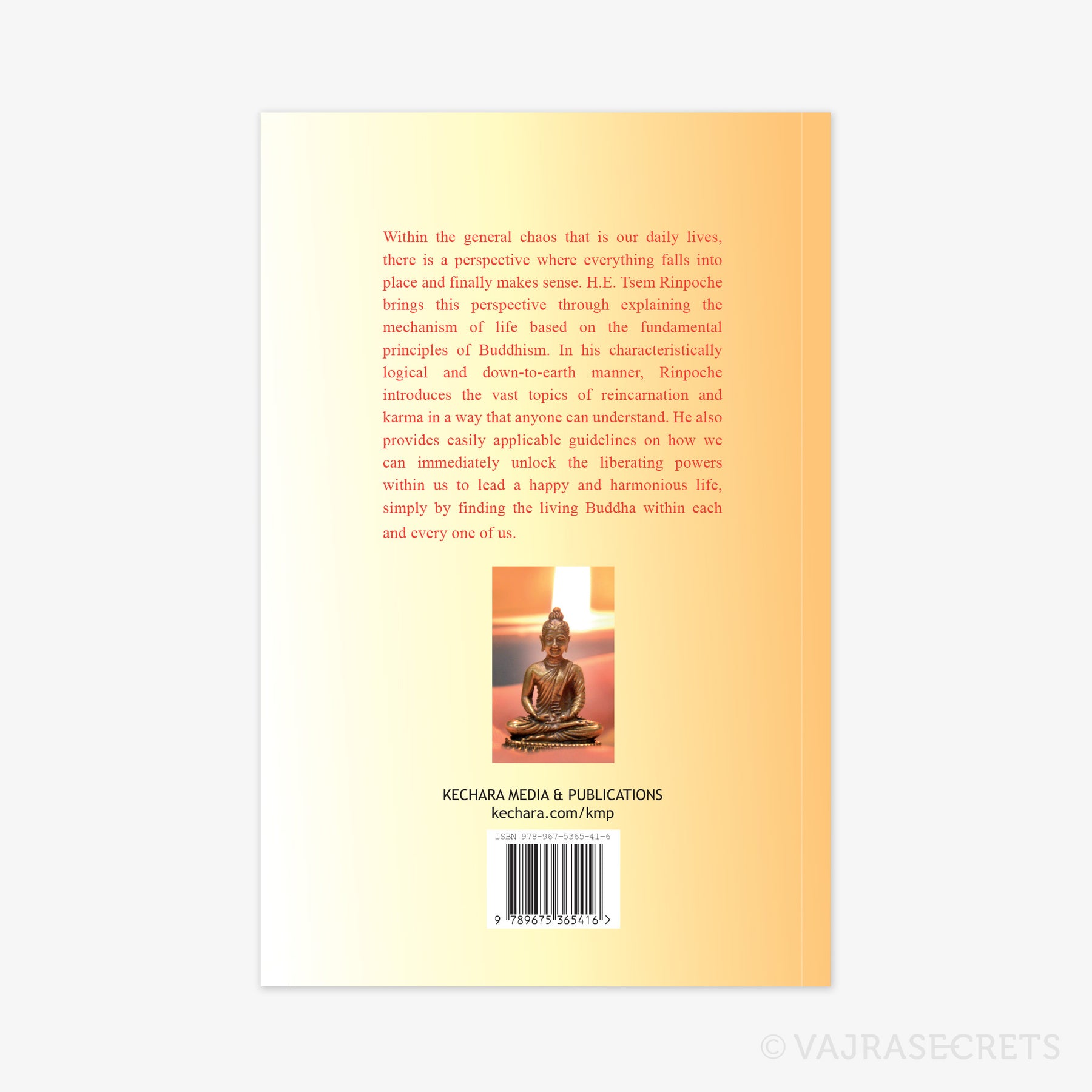 Within the general chaos that is our daily lives, there is a perspective where everything falls into place and finally makes sense. H.E. Tsem Rinpoche brings this perspective through explaining the mechanism of life based on the fundamental principles of Buddhism. In his characteristically logical and down-to-earth manner, Rinpoche introduces the vast topics of reincarnation and karma in a way that anyone can understand. He also provides easily applicable guidelines on how we can immediately unlock the liberating powers within us to lead a happy and harmonious life, simply by finding the living Buddha within each and every one of us.