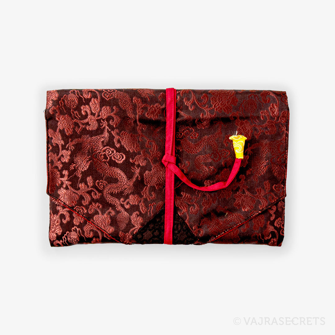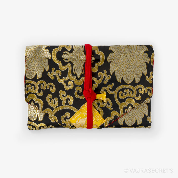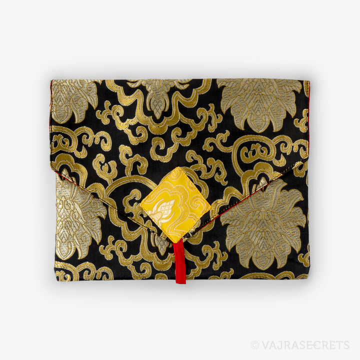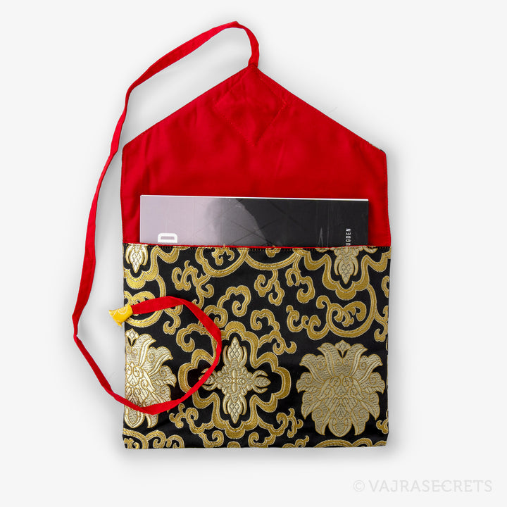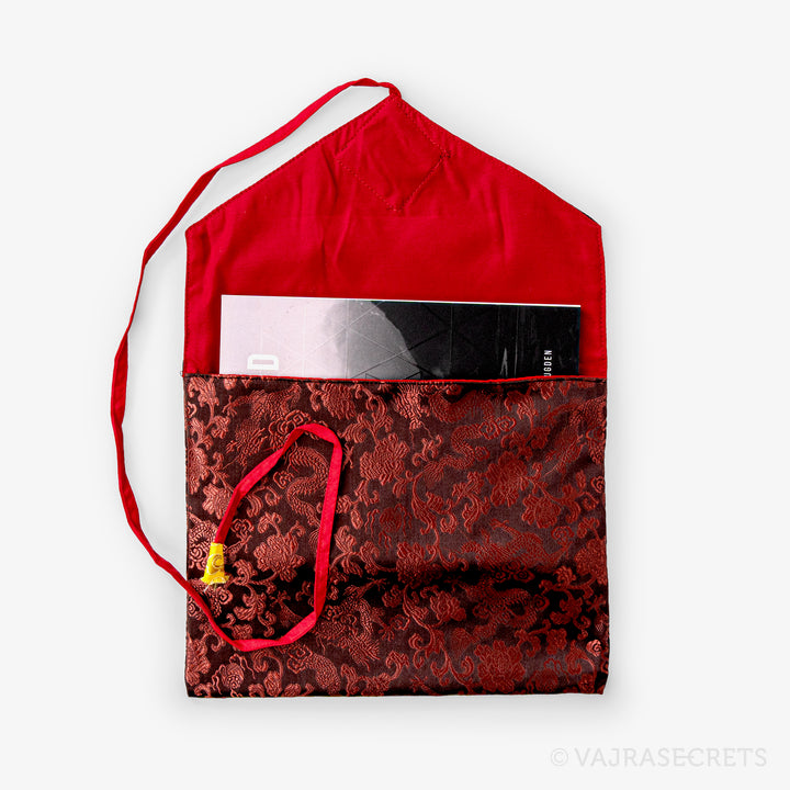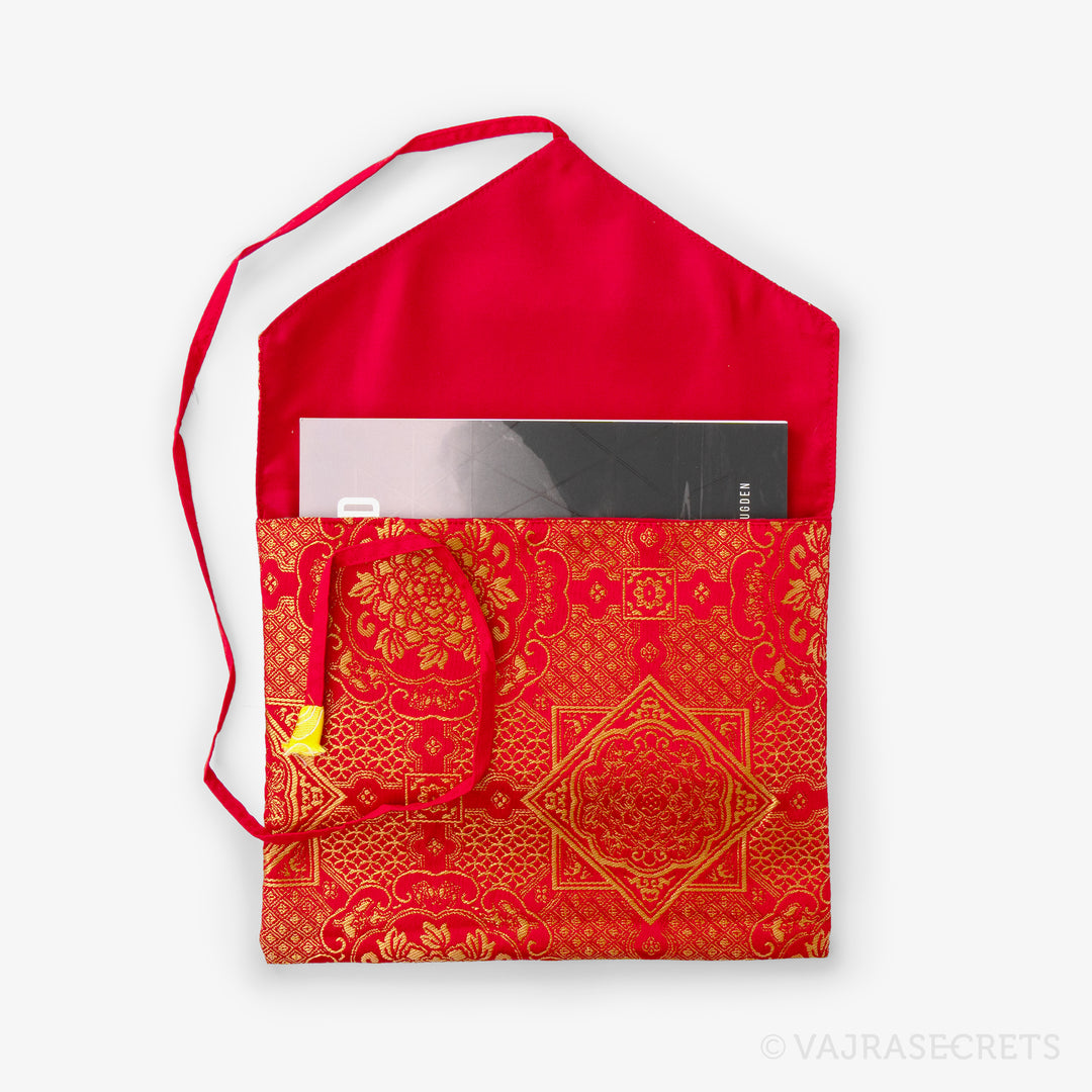 Protect your sacred Dharma books and prayer texts with this traditional Tibetan book cover. Handmade from synthetic silk brocade with traditional motifs, it features an inner cotton lining for extra durability and an envelope-style flap closure with a long strap.