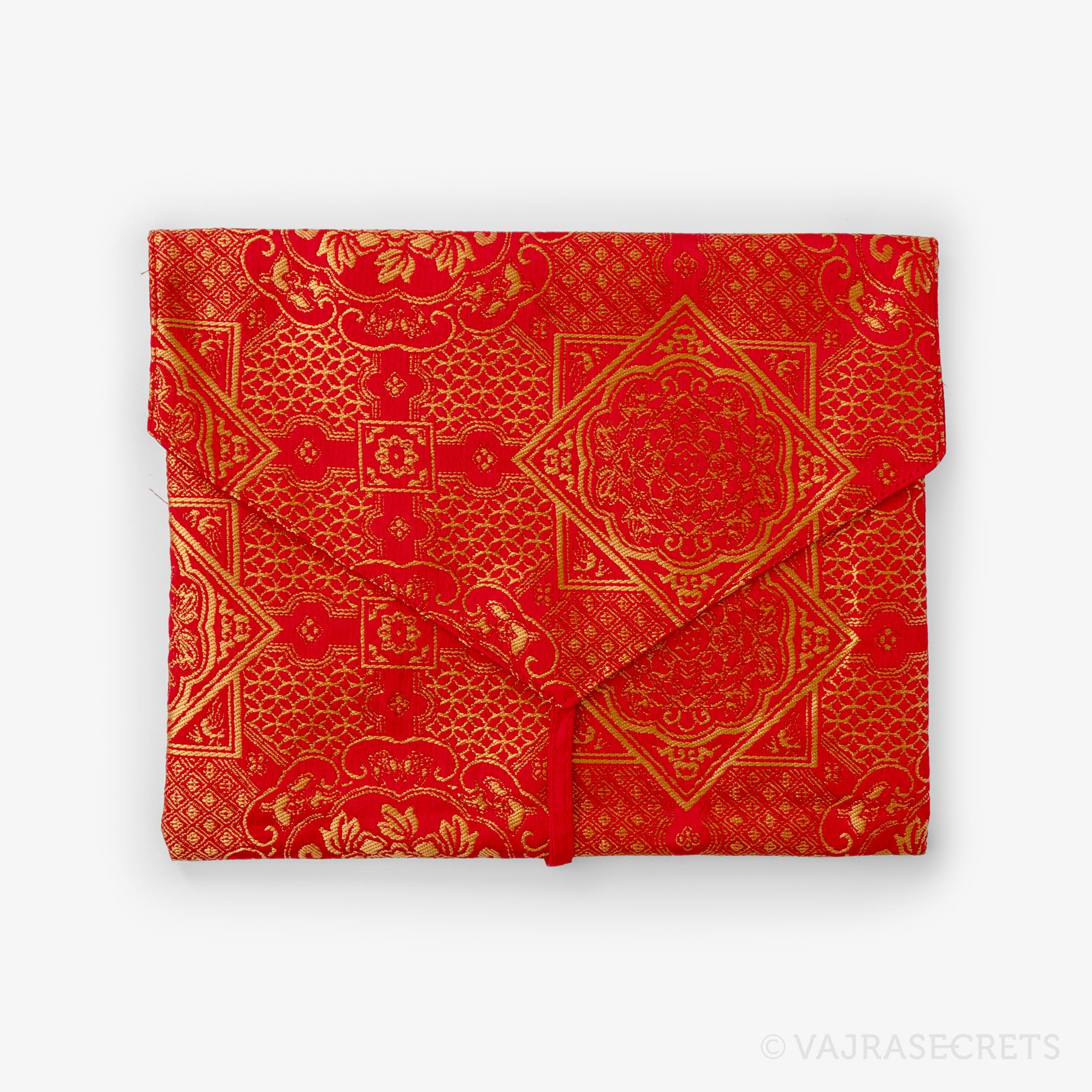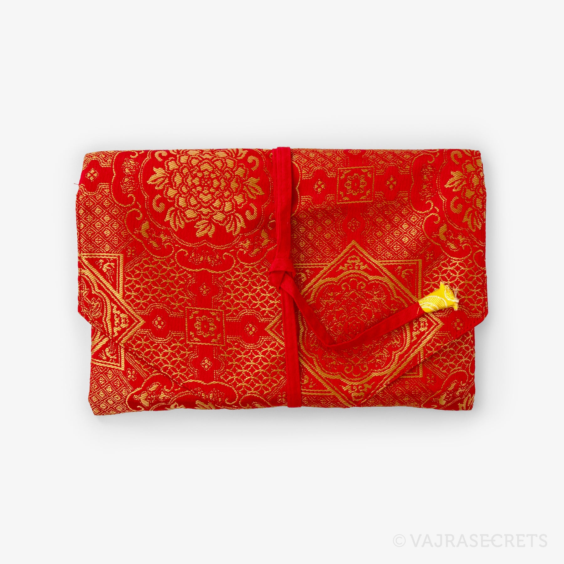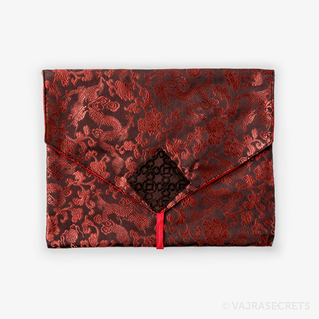 Protect your sacred Dharma books and prayer texts with this traditional Tibetan book cover. Handmade from synthetic silk brocade with traditional motifs, it features an inner cotton lining for extra durability and an envelope-style flap closure with a long strap.