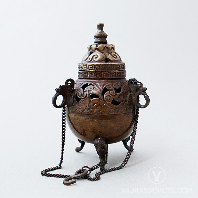 A censer-style miniature Tibetan hanging incense burner with a vintage antique finish and decorated with Tibetan-inspired motifs. Carvings mask ventilation openings that enable the incense burner to be used covered or open.