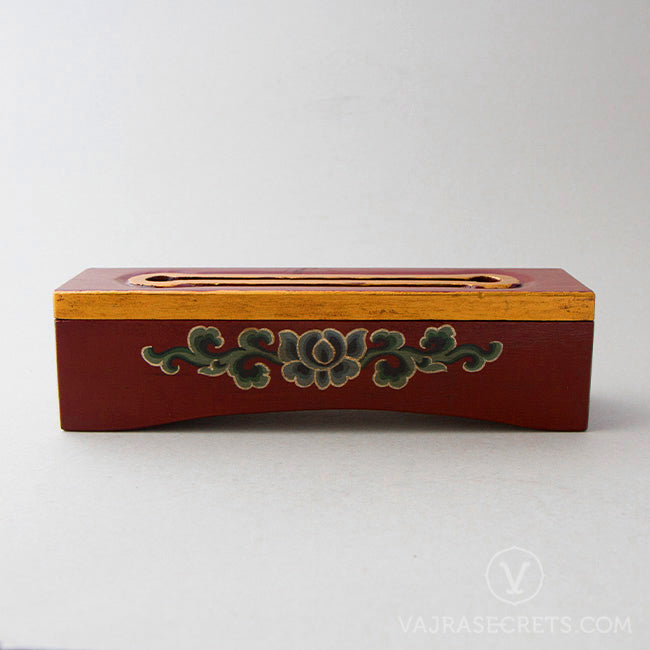 A handcrafted Tibetan-style wooden incense burner carved from Himalayan hardwood. Painted in traditional colours with a Buddhist-inspired lotus motif.