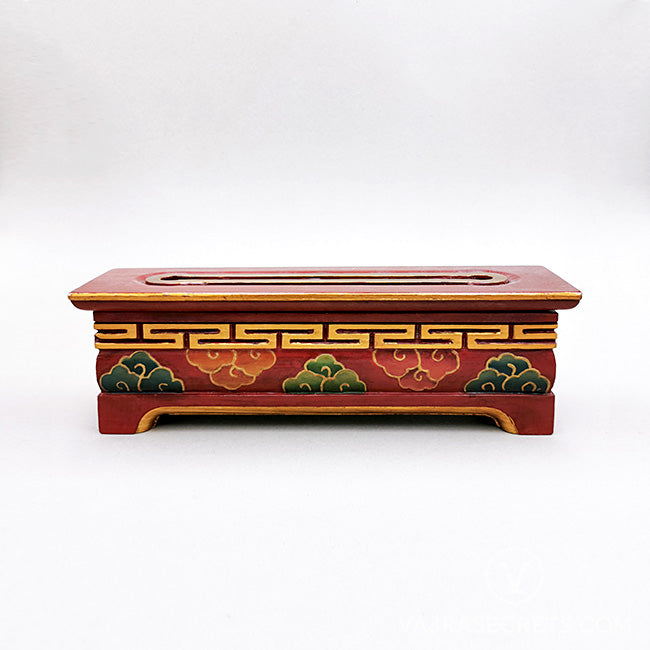 A handcrafted Tibetan-style wooden incense burner carved from Himalayan hardwood. Painted in traditional colours with a rustic cloud motif.