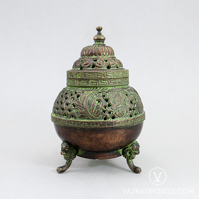 A handcrafted Tibetan-style metal incense burner with a two-toned vintage antique finish and decorated with Tibetan-inspired motifs. Carvings mask ventilation openings that enable the incense burner to be used covered or open.