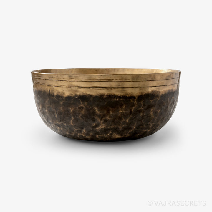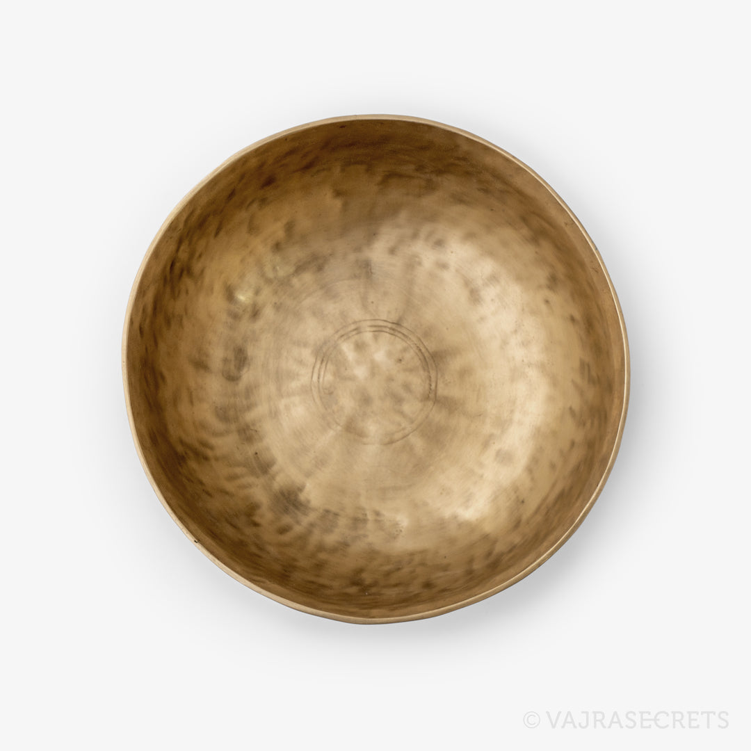 A hand-beaten Ultabati singing bowl for use in meditation sessions, sound healing or to symbolise the offering of sound on a Buddhist altar. Made from seven-metal alloy which includes gold, silver, copper, iron, tin, mercury and lead, it produces a deep, rich and enduring sound that calms the mind and uplifts the spirit. In typical Ultabati style, the mottled exterior is textured with hammer markings and etching lines, and the lip is slightly out-turned. The interior features a brighter brushed finish.