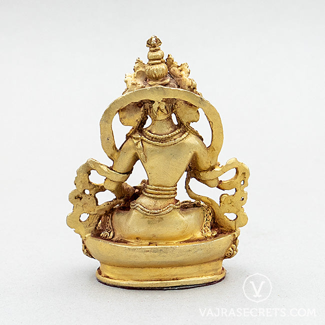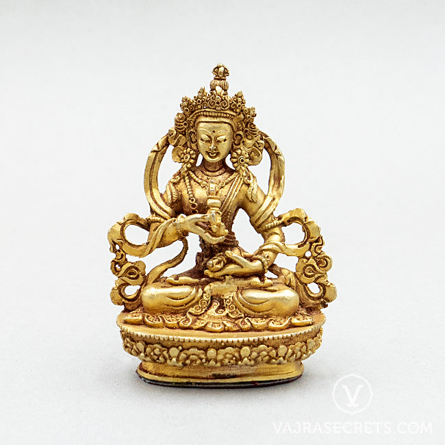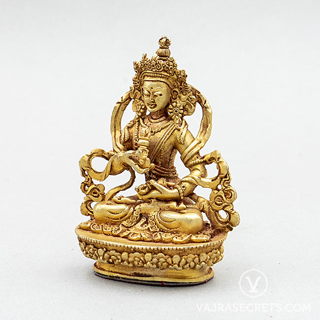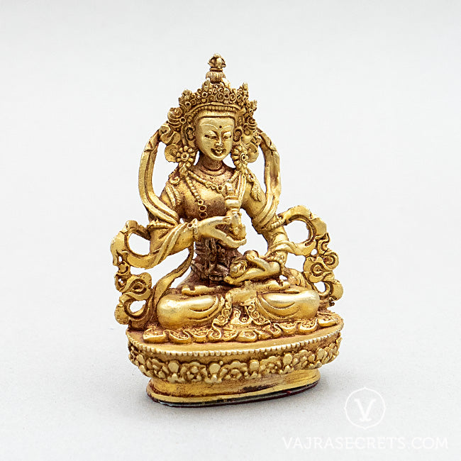A miniature copper statue of Vajrasattva, who represents the purity of body, speech and mind of all the Buddhas. He is highly effective for purifying negative karmic imprints created by the ten non-virtuous actions and transgressions of precepts, vows and commitments. Suitable for small shrine at home, in the workplace, or as part of a portable travel altar.