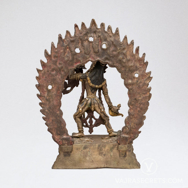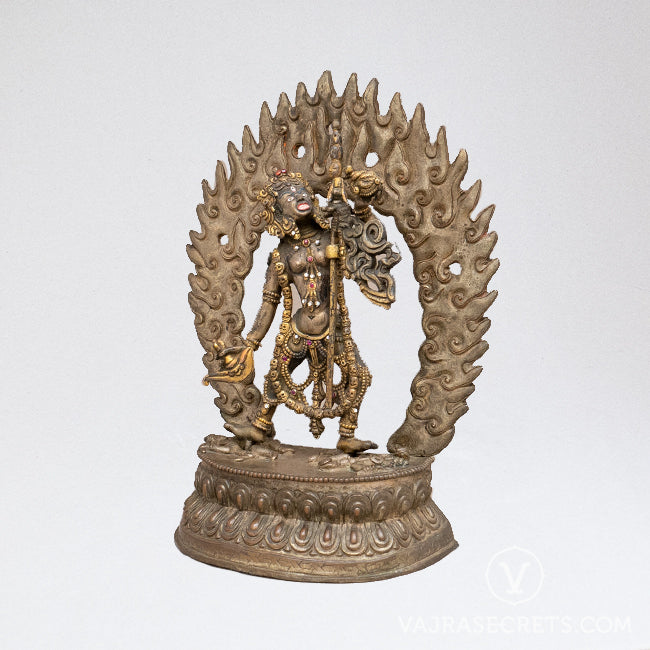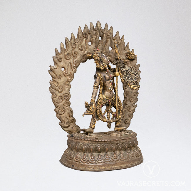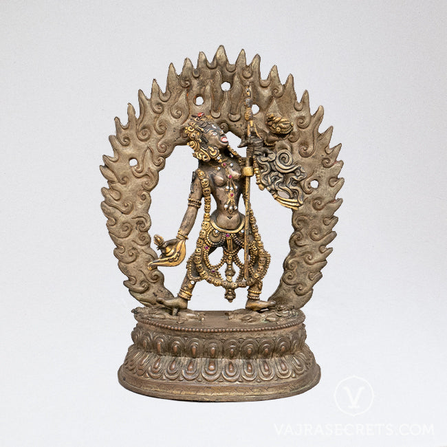 A antique-finished statue of Tantric Buddha Vajrayogini completed with delicately painted deity features. Making offerings to her image makes a connection with this extremely potent Vajrayogini Buddha, as her blessings become more powerful as times degenerate. It is an excellent focal point and meditation aid for those aspiring to advance to higher tantric practices such as hers.