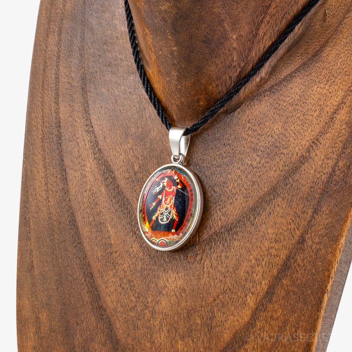 Her body is at the prime of youth and beauty. The red colour of her skin represents the energy of control, and her form is naked to subdue and transform minds that are filled with lust and desire. She wears a crown of five skulls representing the Five Dhyani Buddhas and is adorned with a garland of 50 dried skulls and other bone ornaments.