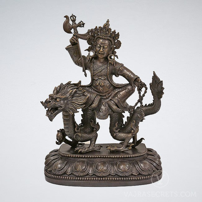An oxidised-finish brass statue of Wangze, the "control" form of Dorje Shugden, revered by many for his ability to bring about stability of mind and positive influence to people and situations for virtuous reasons. It is an excellent focal point and meditation aid for your daily practice.