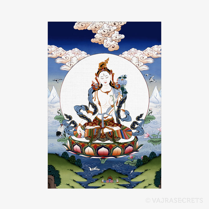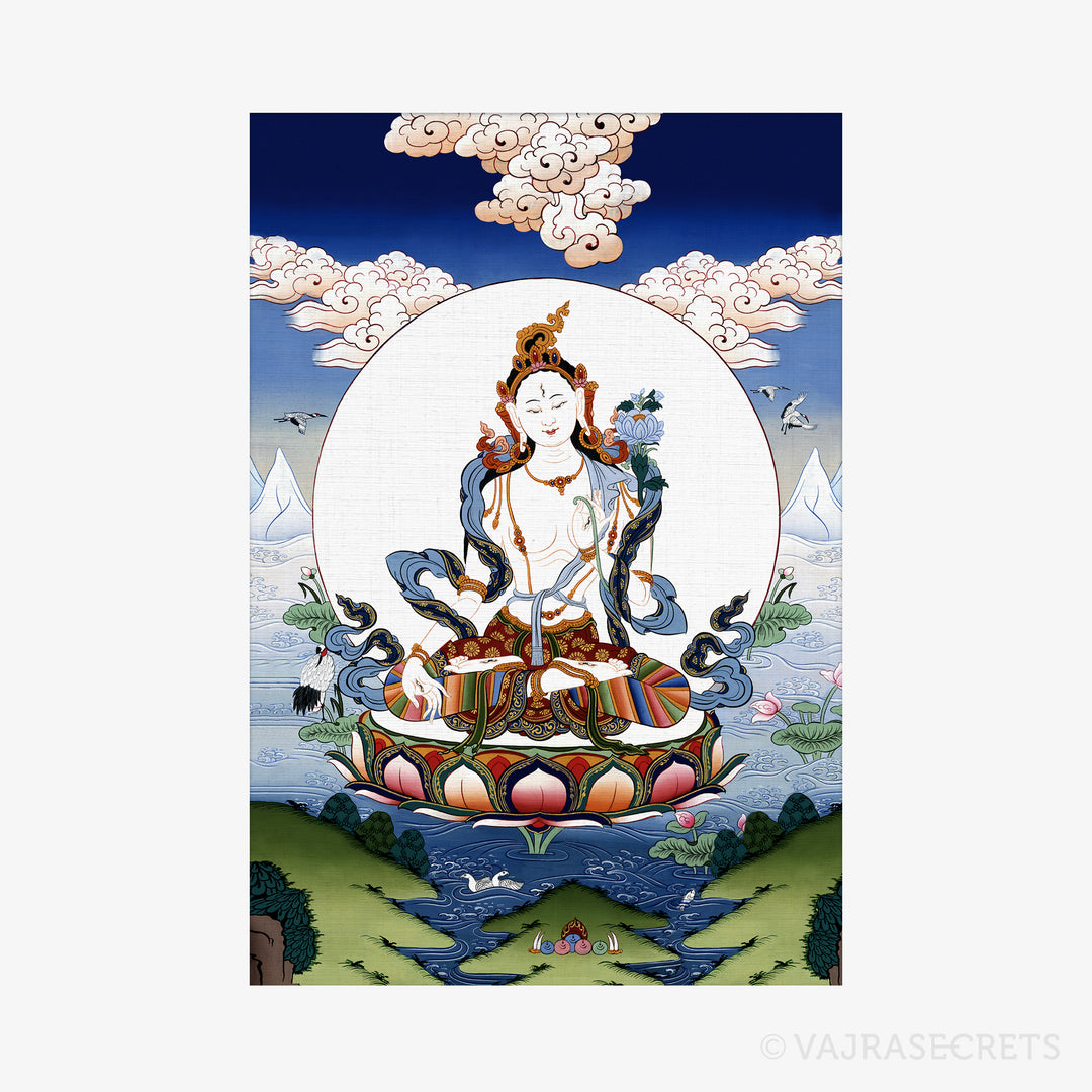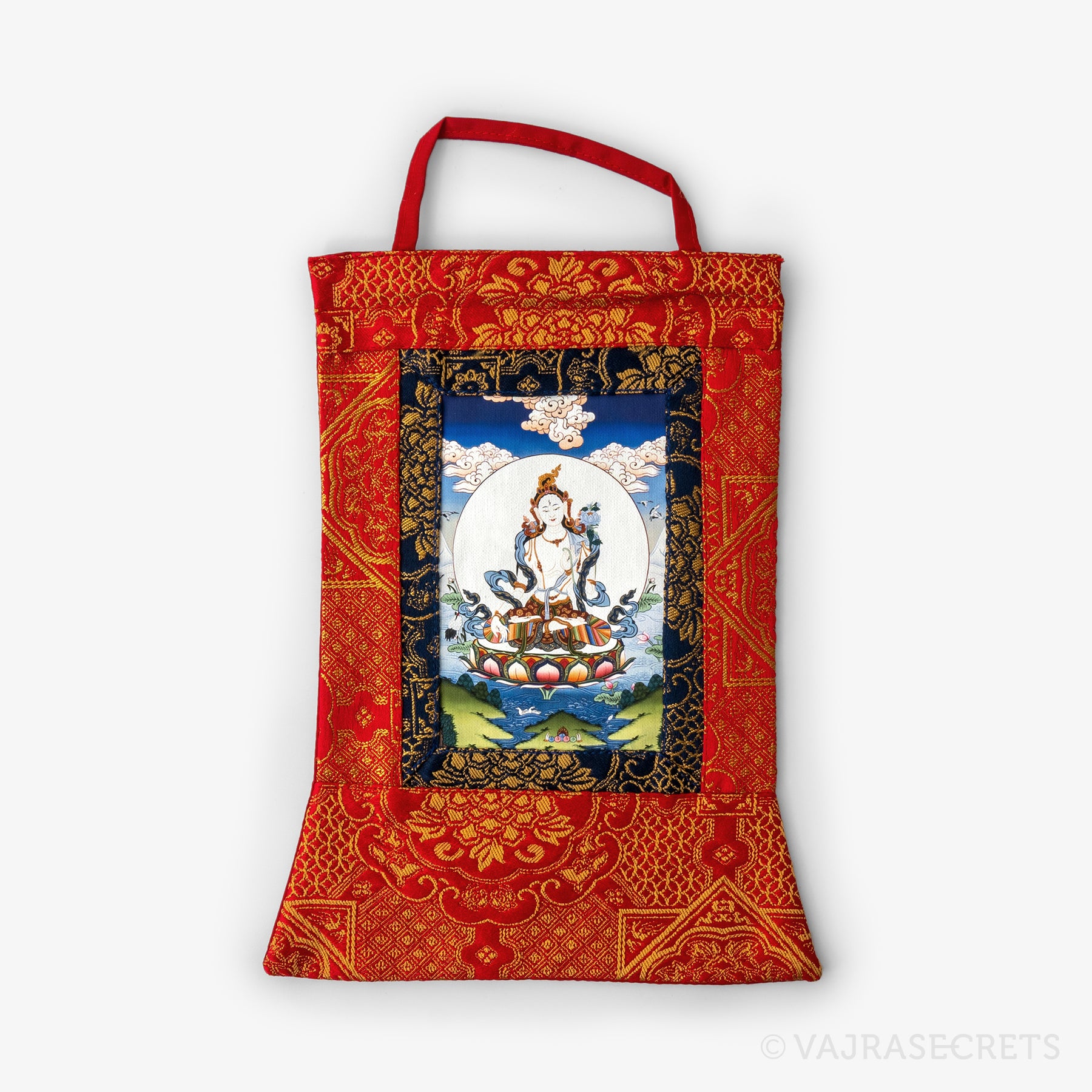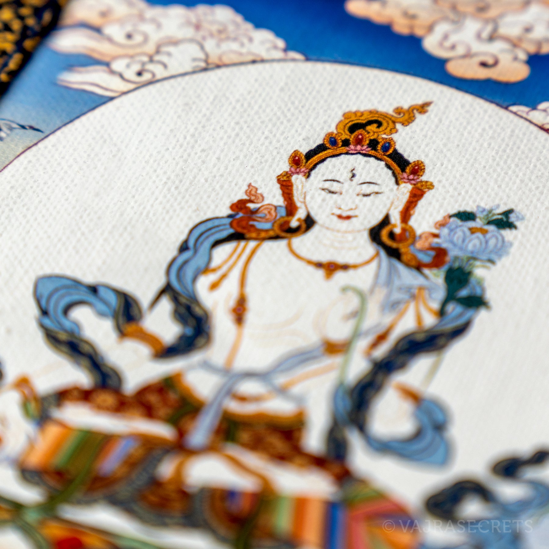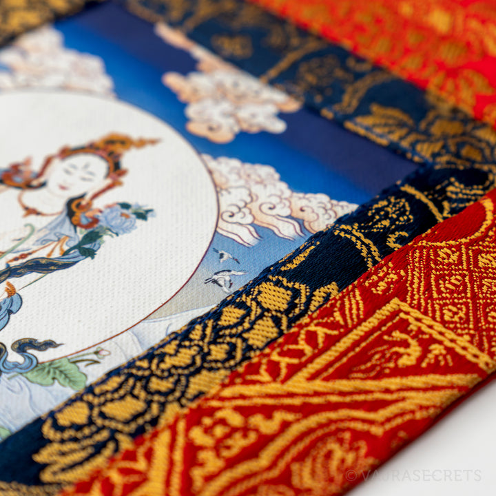 A miniature thangka of the healing female Buddha White Tara, featuring a high quality giclée canvas print and mounted on a rich brocade frame. Known for granting long life and averting life-threatening situations, she is especially beneficial for the elderly and those in need of healing. Well-suited for a travel altar or compact workplace shrine.