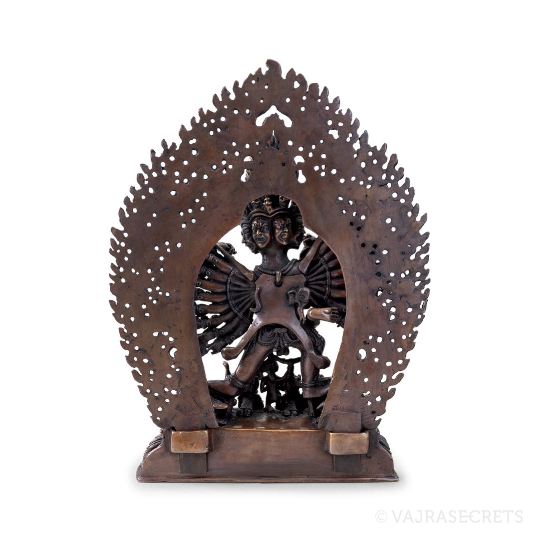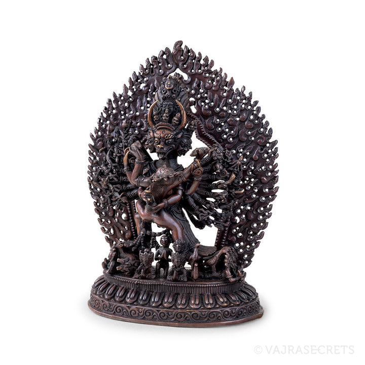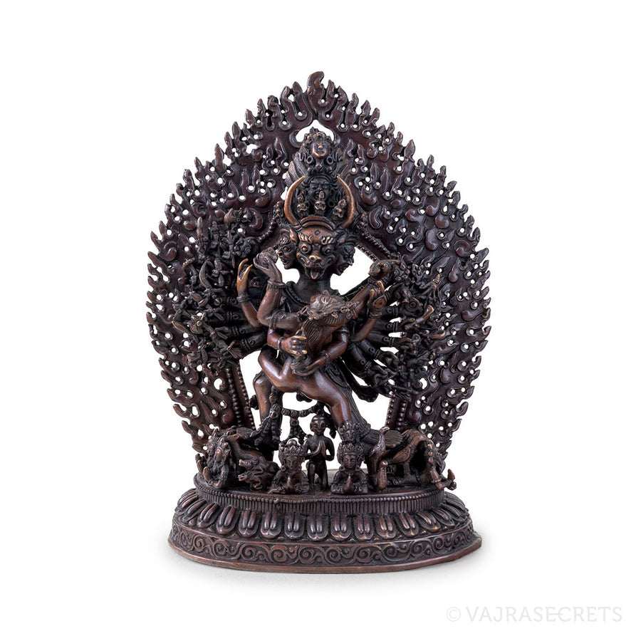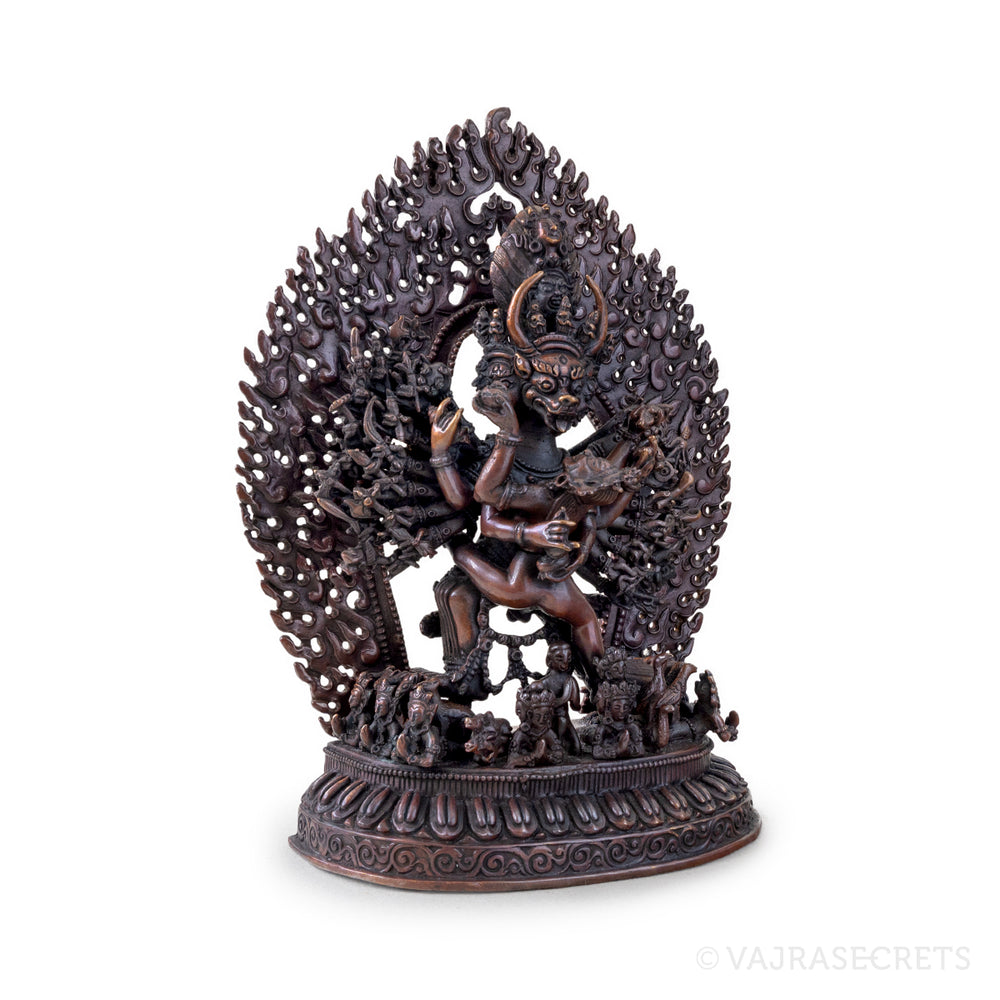A handcrafted copper statue of Tantric Buddha Yamantaka, the ferocious aspect of Wisdom Buddha Manjushri who can purify tremendous negative karma and protect from harmful entities. His profound practice utilises anger as a means to destroy delusions and offers a swift method to achieve higher attainments. Suitable for anyone engaging in his practice and for those aspiring to advance to highest yoga tantra practices.